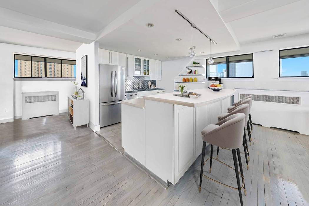 Upon entering the foyer, you will be in awe of this special and unique duplex home. The living and dining areas are all seamlessly combined to create the perfect balance of space for any occasion, with 360-degree views and a welcoming layout for all. The large, high-set windows draw in natural, sun-flooded rays of light at all hours of the day – it is truly one-of-a-kind.