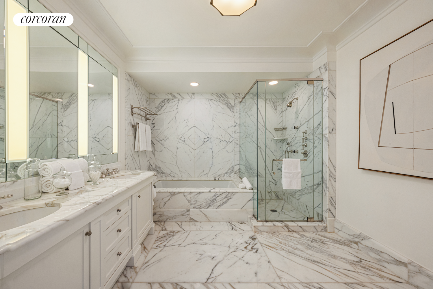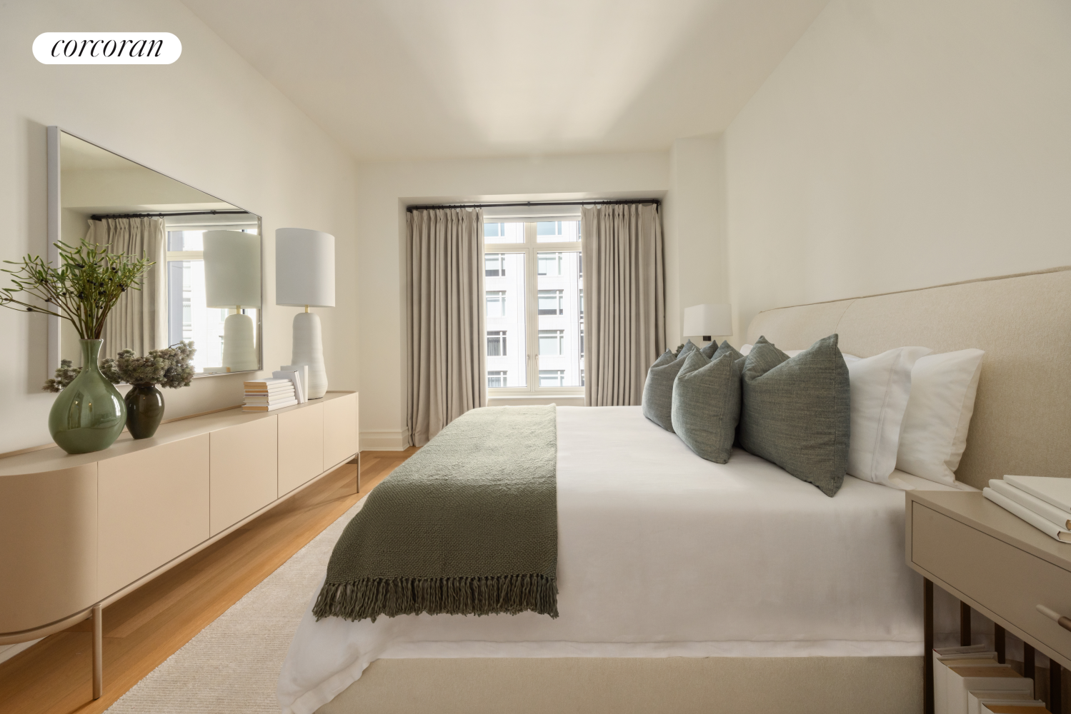 The richly appointed primary bedroom suite floats on Central Park with mesmerizing views. It includes two dressing rooms with custom built-ins and a lavish marble bathroom with two sinks, a bathtub, and an oversized shower. The separate west wing of this home features three additional bedrooms (or two bedrooms and a library) and two renovated bathrooms.