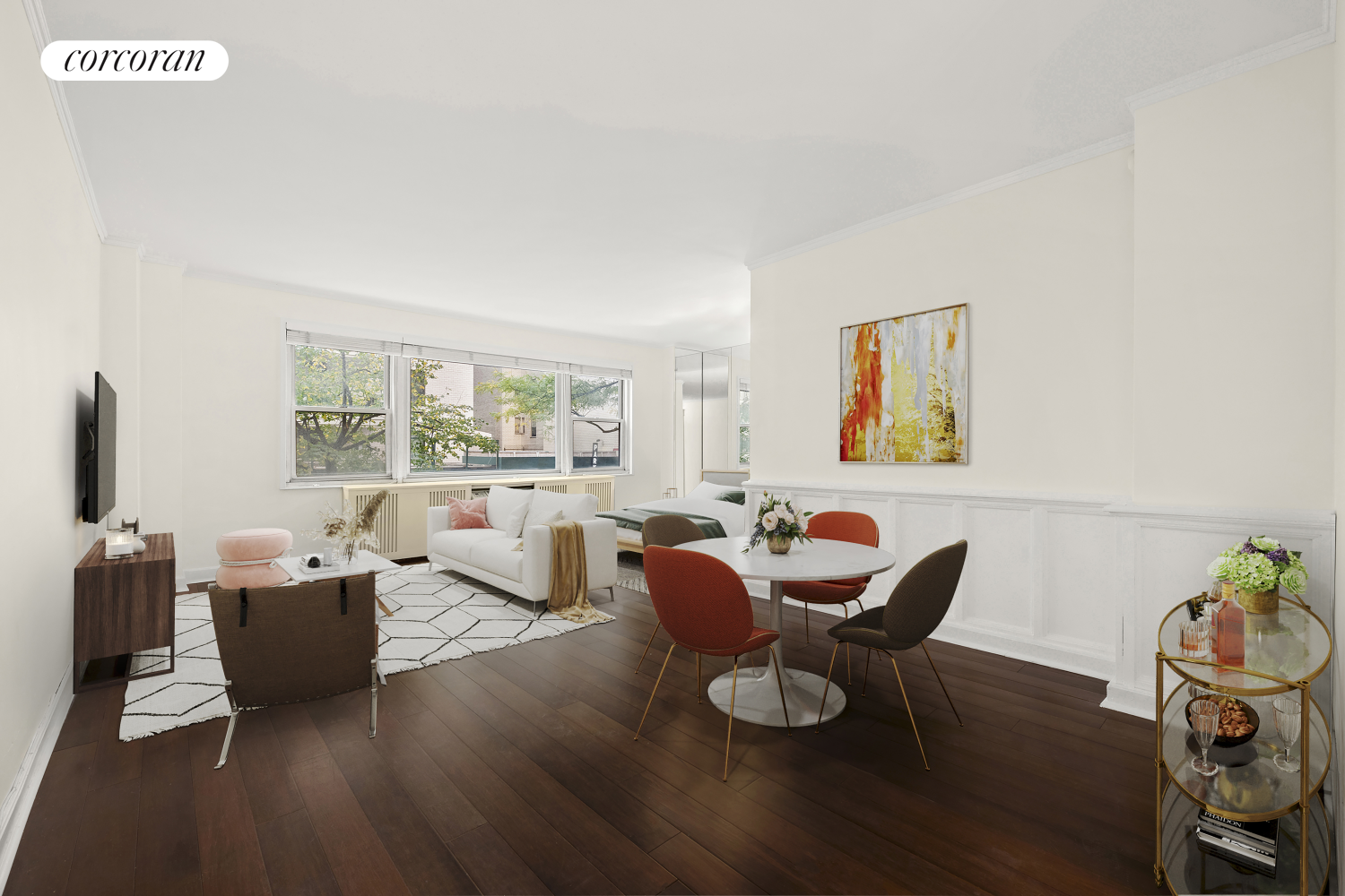 Welcome to 167 East 67th Street, Apt. 2B-a charming alcove studio ideally situated in the heart of the Upper East Side, mere blocks from Madison Avenue and Central Park. With serene tree-top views, this bright and airy studio offers a well-defined sleeping area, beautiful hardwood floors, and refined details like wainscoting and crown molding that add an elegant touch to the space.