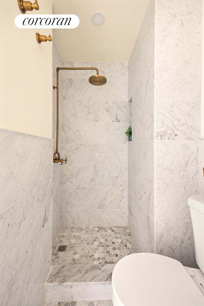 The top floor features three light-filled bedrooms, including a king-sized primary bedroom with a wall of closets. A wonderfully designed and spacious bathroom comes complete with a skylight. All THREE of the full bathrooms throughout the house have a rich and stylish design that features Carrara marble wall tile, walnut vanities, oversized medicine cabinets and either marble penny tile or wood grain tile. All beautifully punctuated with aged brass plumbing fixtures and accessories.