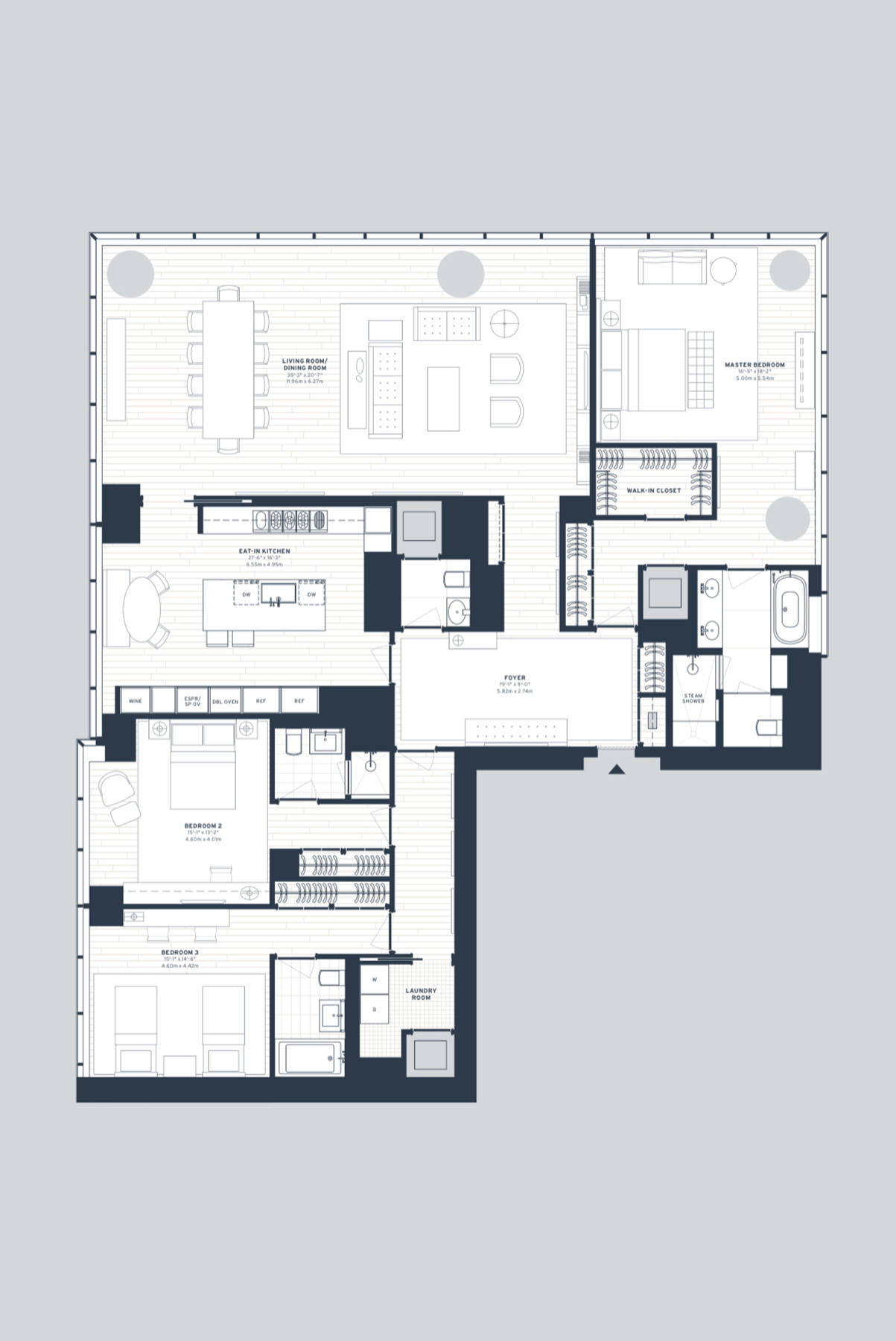 The flow of this apartment is excellent with well-proportioned bedrooms situated in two separate wings. The primary bedroom sits in the north-eastern corner of the building, dazzling with its incredible light and views of the park and cityscape. The en-suite, windowed bathroom is spacious and elegantly clad in a white/grey Carrara marble – it offers a stunning stall shower with book-matched marble slab tiling, a separate water closet, jacuzzi bathtub, a double vanity in a beautiful Nero Voda marble, fantastic storage and radiant heated flooring. The secondary and tertiary bedrooms face due west and can accommodate a king-size bed. Both feature a double-closet and en-suite bathroom finished in the finest materials of onyx and marble.