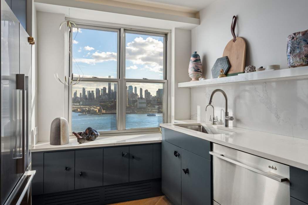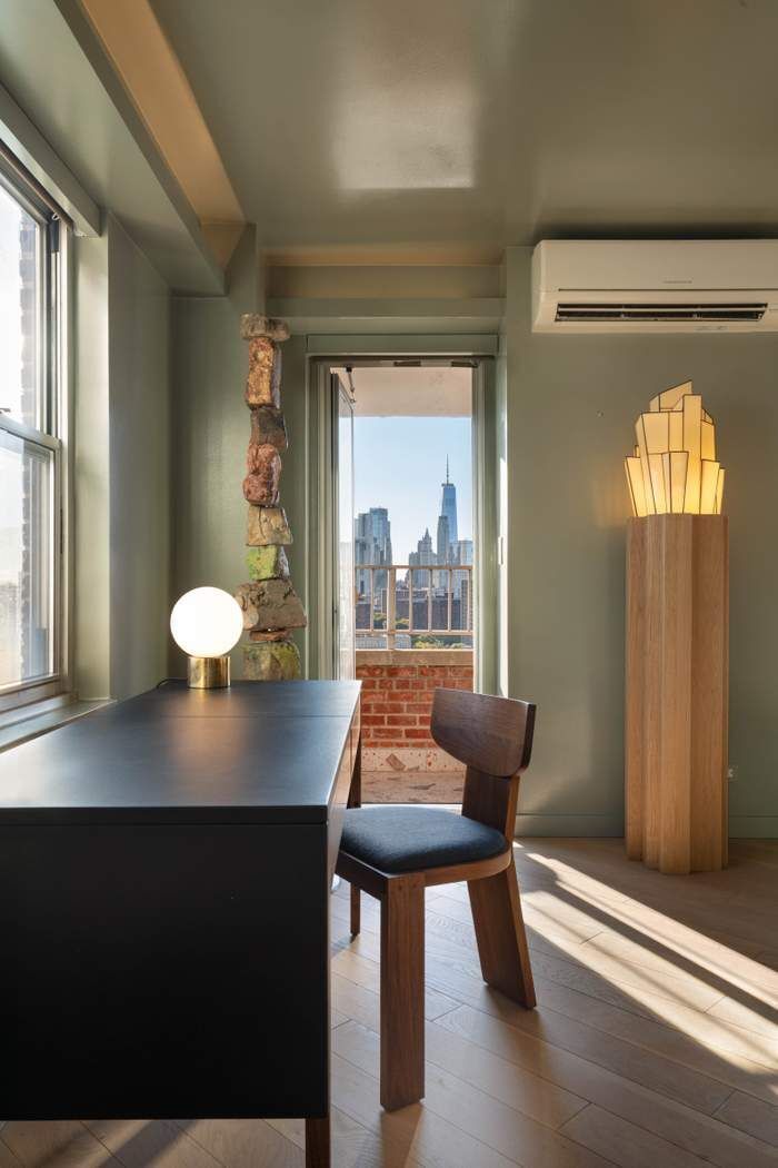 The primary bedroom suite is a serene retreat with stunning views of the Manhattan skyline and direct access to the terrace. A wall of custom-outfitted closets offers elegant, built-in organization, while the spa-inspired primary bath showcases Grohe fixtures, custom brass details, and Michael Anastassiades lighting, creating an atmosphere of understated luxury.