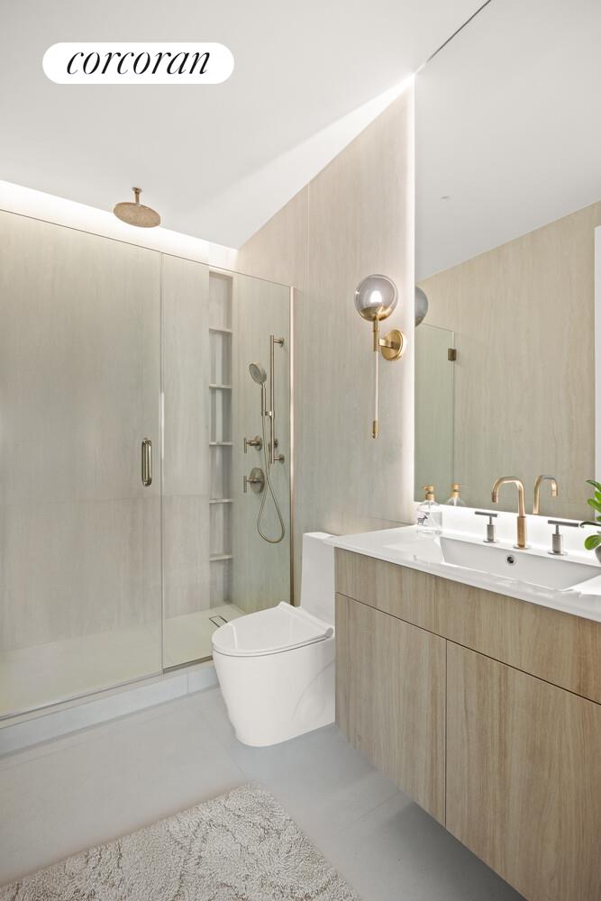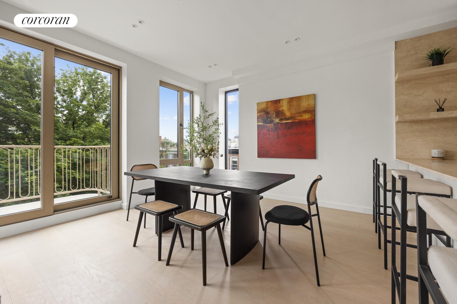 The 25-foot-wide living room is a showstopper - bathed in South Eastern light from dual exposures and seamlessly connected to a second balcony. This space has room for sectionals, play areas, and a large dining room table that can seat 8. The kitchen, wrapped in Travertine stone featurs a Fisher & Paykel refrigerator, Bosch dishwasher, large wine fridge, and a gas range with vented hood. A sprawling countertop offers prep surface and bar seating with storage galore underneath.