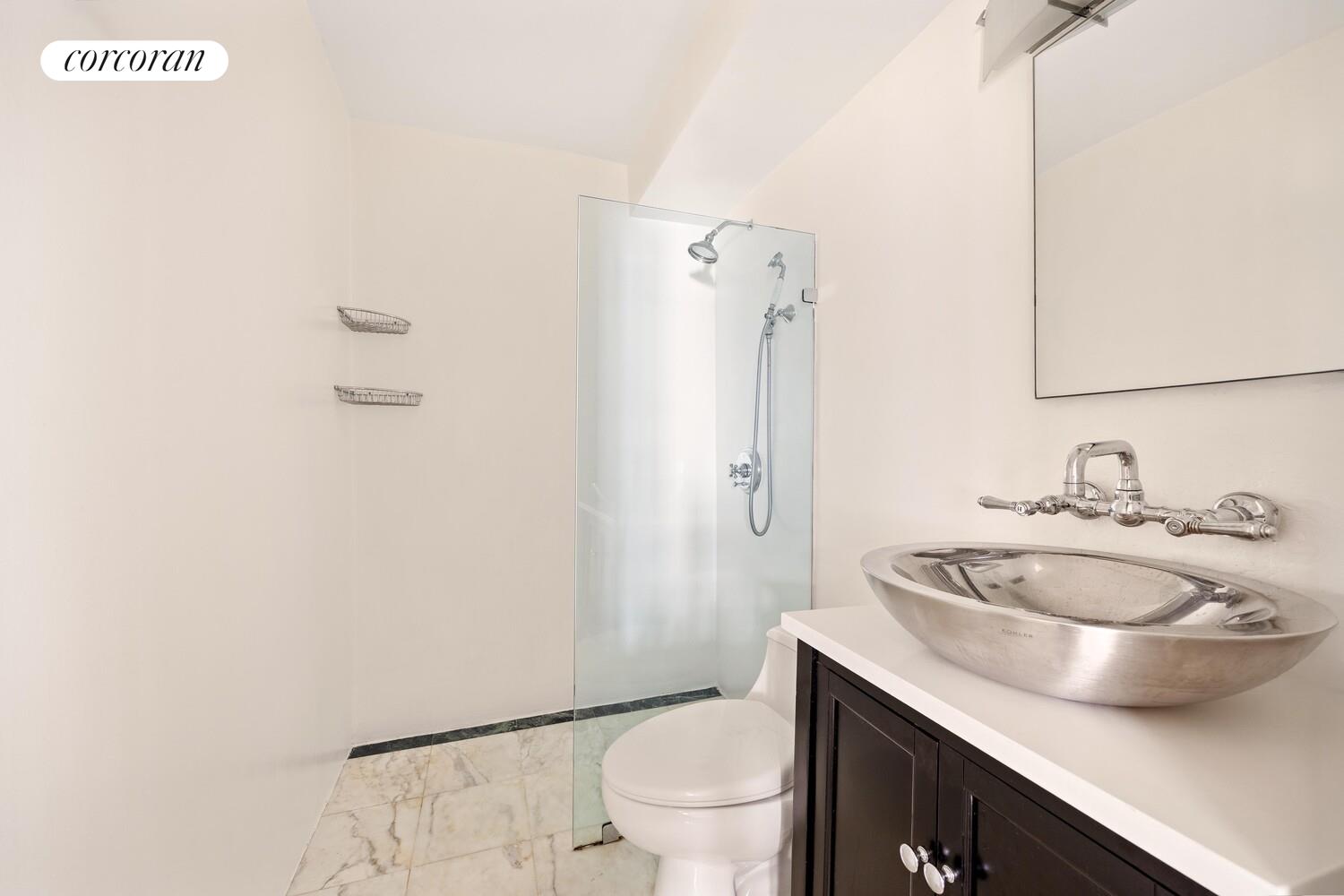 The bathroom has also been renovated with a glass-wall shower, marble flooring and stainless steel basin sink. There is also an adjacent dressing room with a large, mirrored door closet plus 2 additional closets for even more storage.