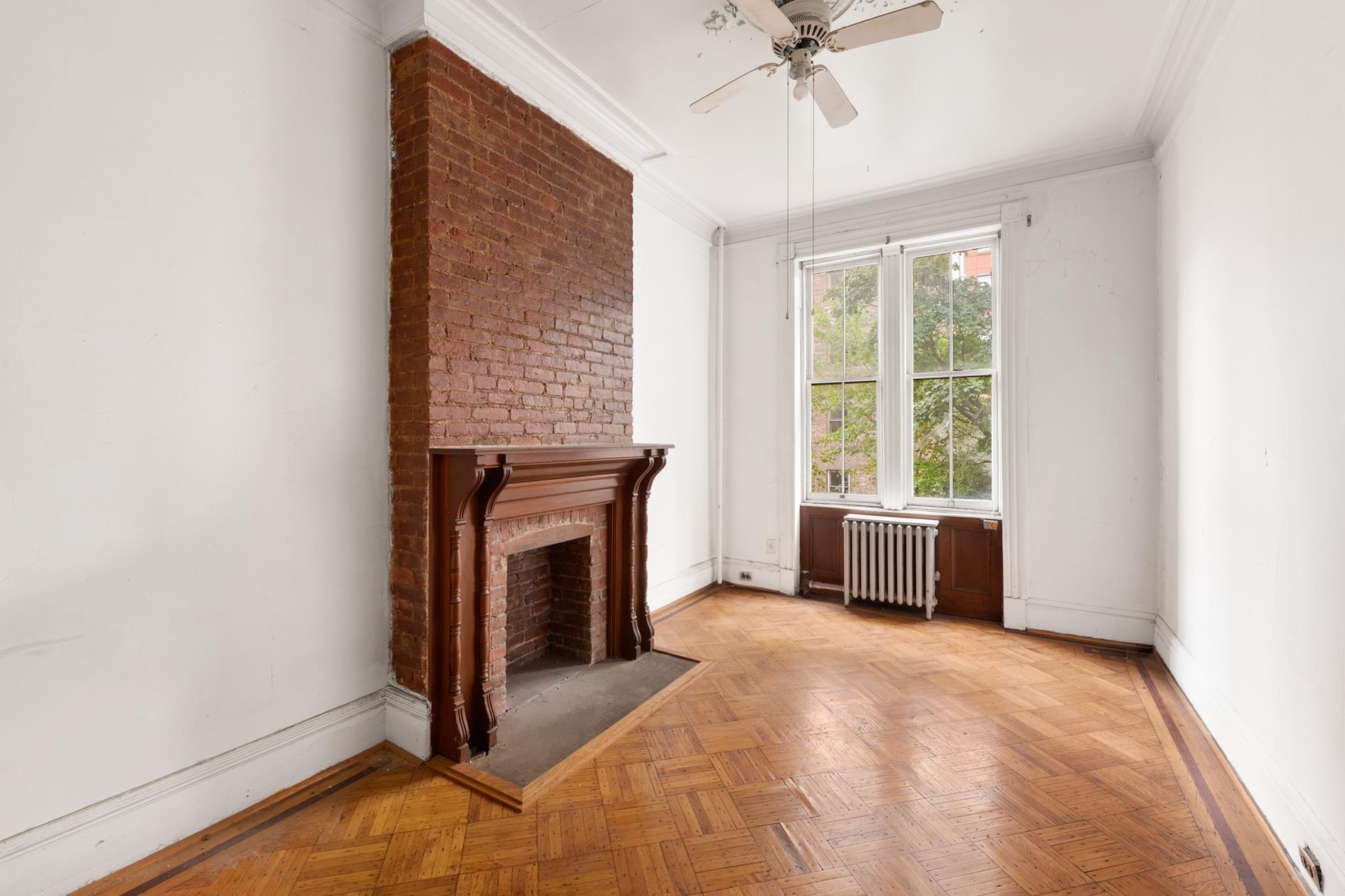 On a quiet, tree-lined block near 105th Street, just off Central Park, this single-family townhouse was built in the 1890s and retains its architectural character. Original wood fireplaces and carved mantels appear in room after room, with stained-glass window detail, arched openings, pocket doors, and parquet floors throughout. East and west exposure brings light across the day, and a skylight brightens the upper stair hall. A deep, leafy backyard with a beautiful mature tree creates a natural bird sanctuary. The house is ideal for a preservation-minded renovation, with the option to modernize in phases while honoring the craftsmanship that makes it special. Neighborhood highlights include Central Park’s North Woods, the Cathedral of St. John the Divine, Columbia University, and easy access to the B, C, and 1 trains.