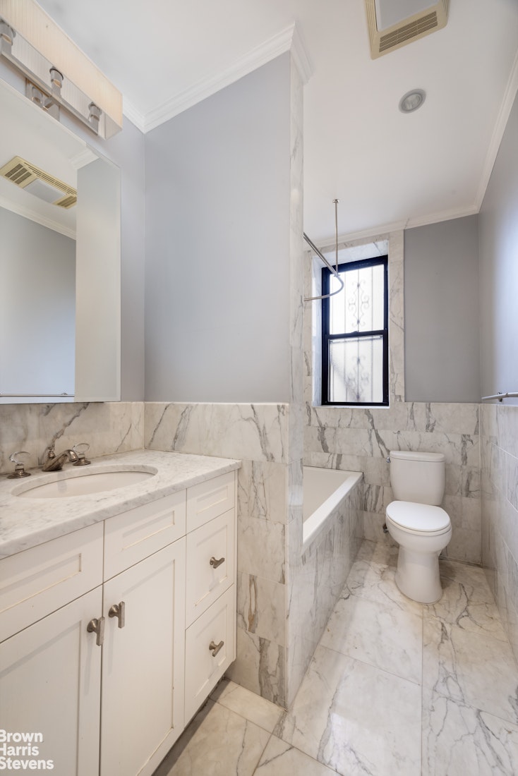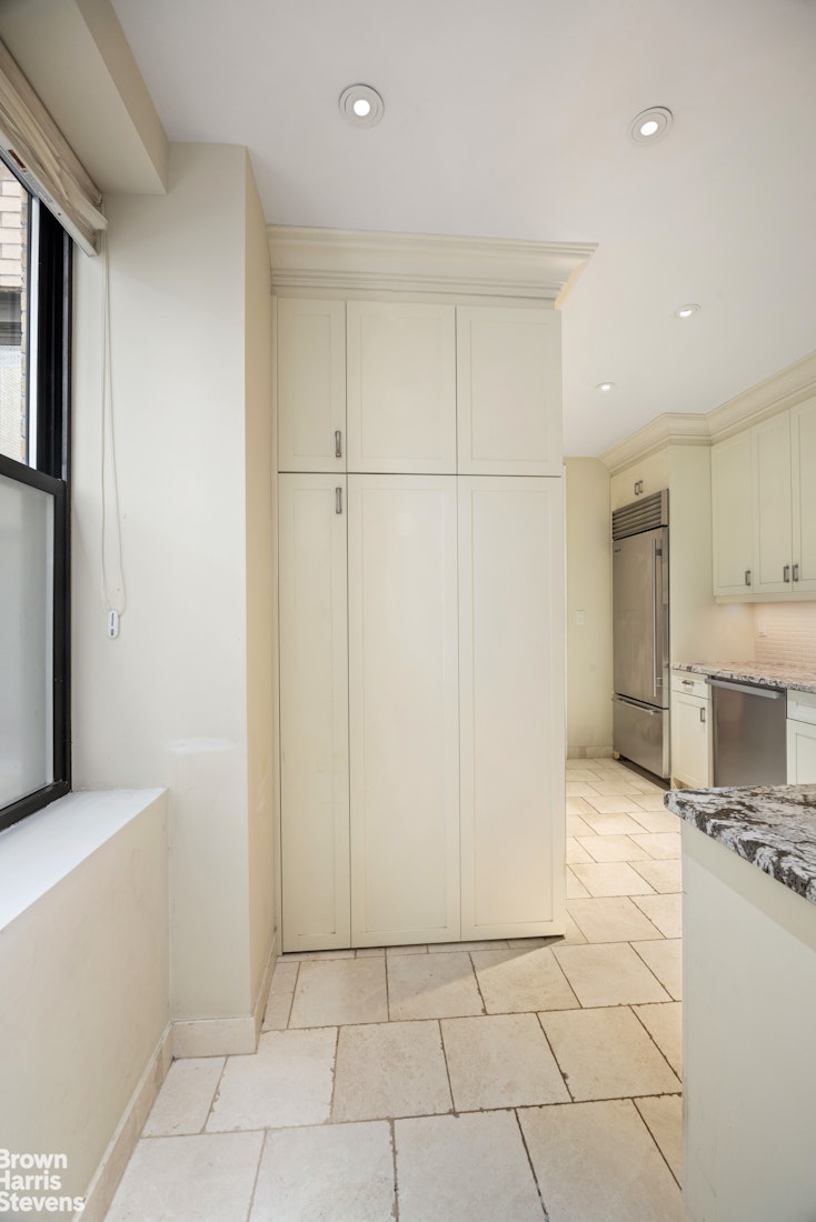 The windowed, renovated kitchen is outfitted with Miele and Sub-Zero appliances and abundant cabinetry. Both full baths are in excellent condition, finished in marble with Waterworks fixtures; one offers a deep soaking tub. In-unit washer/dryer and thru wall air conditioning.