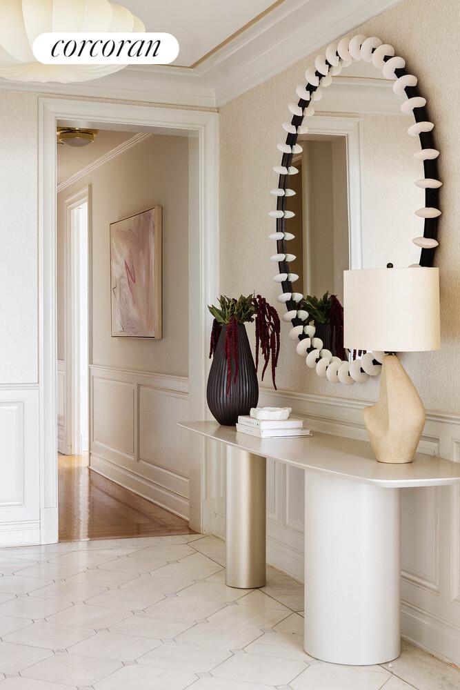Upon entry, the grand foyer welcomes you into a light-filled haven, featuring floor-to-ceiling windows with direct views of Central Park. 10-foot ceilings and triple exposures ensure abundant natural light throughout the day, enhancing the home's refined ambiance.