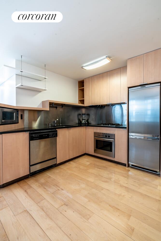 One of a kind custom apartment.  Very spacious corner unit with custom renovations.  The open kitchen features granite counters, stainless steel appliances to match the stainless steel back splash and custom cabinetry; the bathroom features Oceanside tessera field glass tile.  Tremendous living room has built in home office desk area, and a large separate dining bay that can accommodate a large dining table; eastern & southern exposure; custom built in closets and storage spaces throughout the apartment; king sized bedroom.