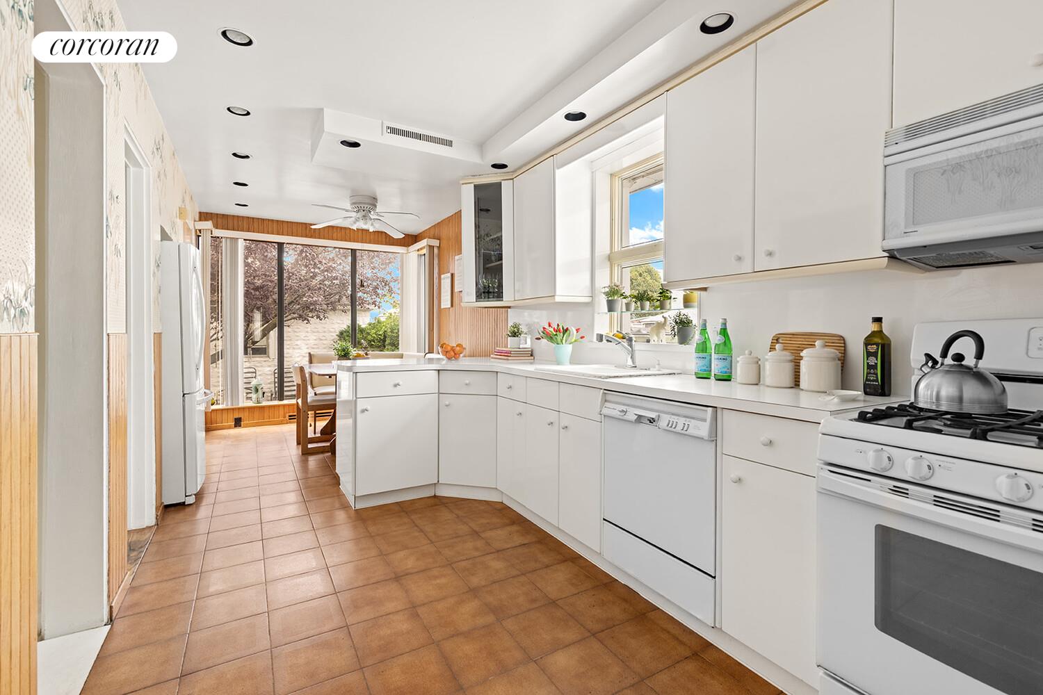 The parlor level features a bright, west-facing living room with a decorative fireplace and mantle, arched doorways, and built-ins that add warmth and charm. A sun-drenched sunroom wrapped in windows enjoys southern and western exposures, while the formal dining room provides plenty of space for gatherings.