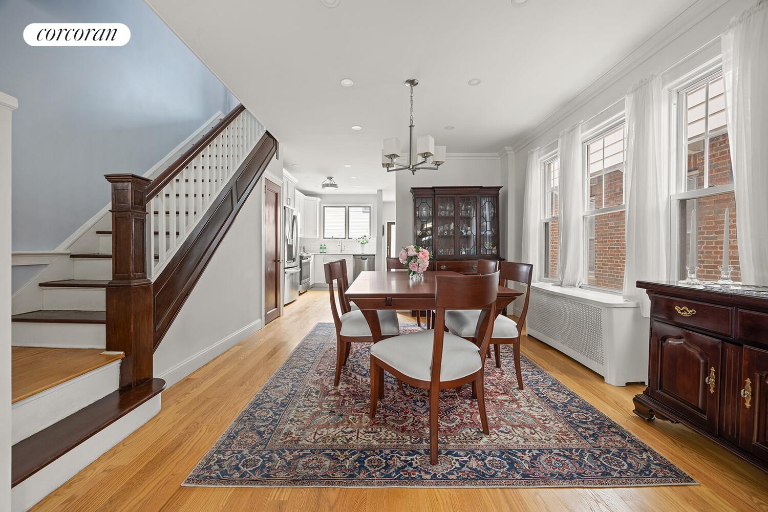 Upon entering the parlor level, you'll immediately notice the open layout, high ceilings, and abundant natural light. The inviting sunroom, framed by south-, west-, and north-facing windows, features original stained-glass transoms that add a touch of vintage charm. The spacious living room is anchored by a decorative fireplace and mantle, creating a warm focal point that flows seamlessly into the formal dining room - large enough to host dinner for twelve or more.