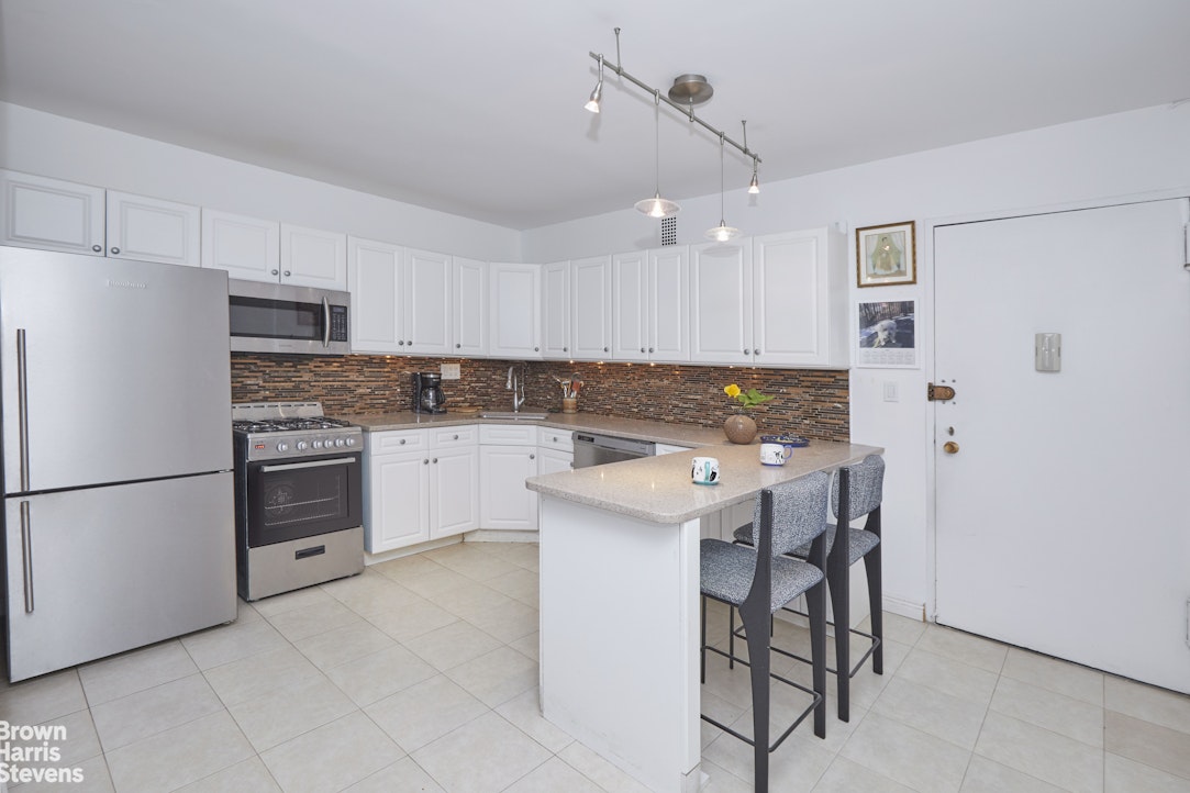 A generous open eat-in kitchen features Silestone quartz countertops, a custom-tiled backsplash, and a dining bar. Stunning Hudson River views will captivate both you and your guests. The flexible floor plan allows for an easy conversion to a one-bedroom, and a full wall of closets provides excellent storage. The bathroom has been tastefully renovated.