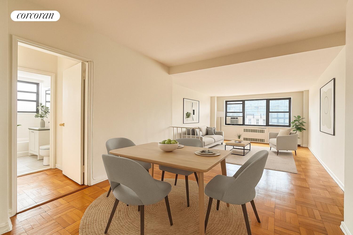 The drop down living room is incredibly spacious, with a fully separate space for dining. Oversized windows bring in abundant sunlight throughout the day, while the higher-floor vantage point ensures quiet, peaceful living above the neighborhood bustle. The kitchen provides generous cabinetry and functional workspace.  FLEX 2 bed, 2 bath. The terrace is its own incredible sanctuary.
