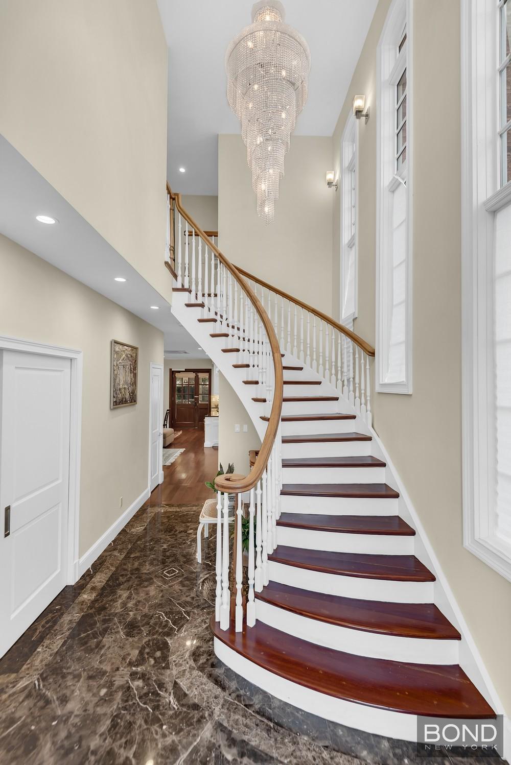 The grand foyer sets the tone, showcasing 21-foot ceilings, a sweeping staircase, and a showstopping chandelier that instantly captivates. Just off the entrance is a private room with its own full bathideal as a guest suite, media room, or home office. Continue through the main level to discover an expansive open-concept living room, dining area, and chefs kitchen that seamlessly flow together beneath magnificent 11-foot ceilings. The kitchen is equipped with Sub-Zero refrigeration, Wolf cooking appliances, quartz countertops, and beautifully crafted custom cabinetry. A convenient half bath and access to the covered patio and generous backyard complete this exceptional floor.