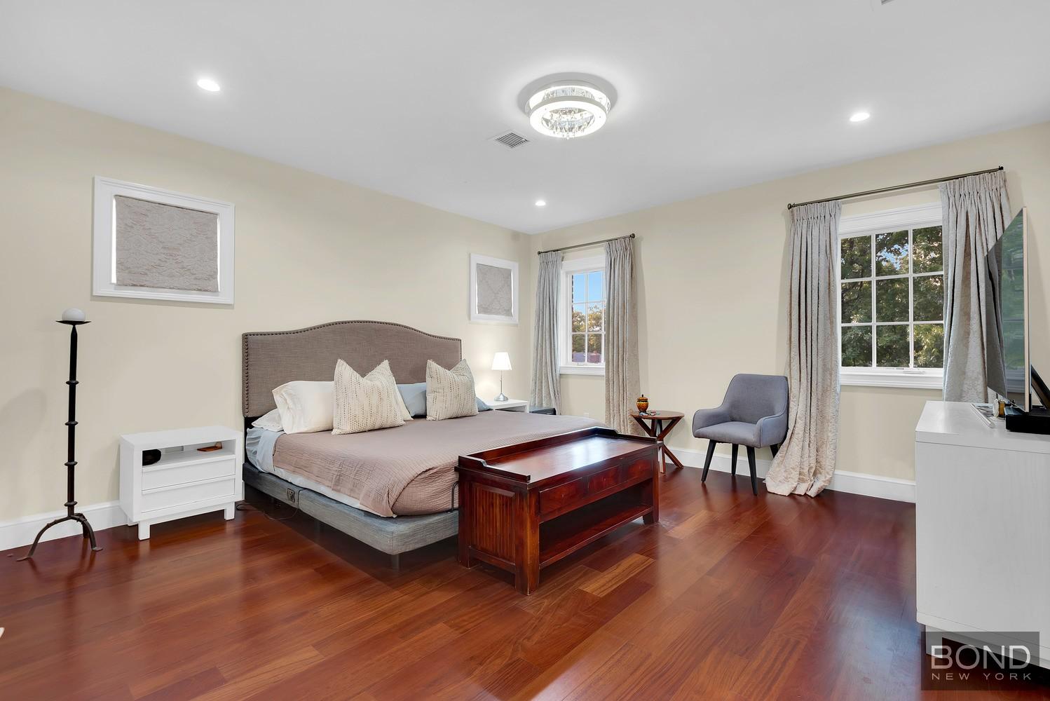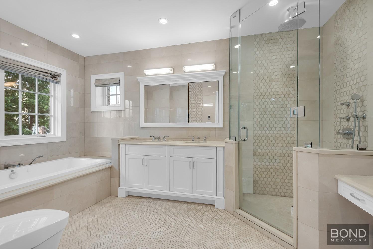The second level offers three spacious bedrooms, including a serene primary suite designed to feel like a personal retreat. The main hall bath is ADA-accessible for added convenience. The oversized primary bedroom is complemented by an extraordinary walk-in closetlarge enough to function as a dressing room or private officeand a spa-inspired ensuite featuring radiant heated floors, a double-wide vanity, a luxurious whirlpool tub, and rainfall shower. This level continues the homes airy elegance with 10-foot ceilings throughout.