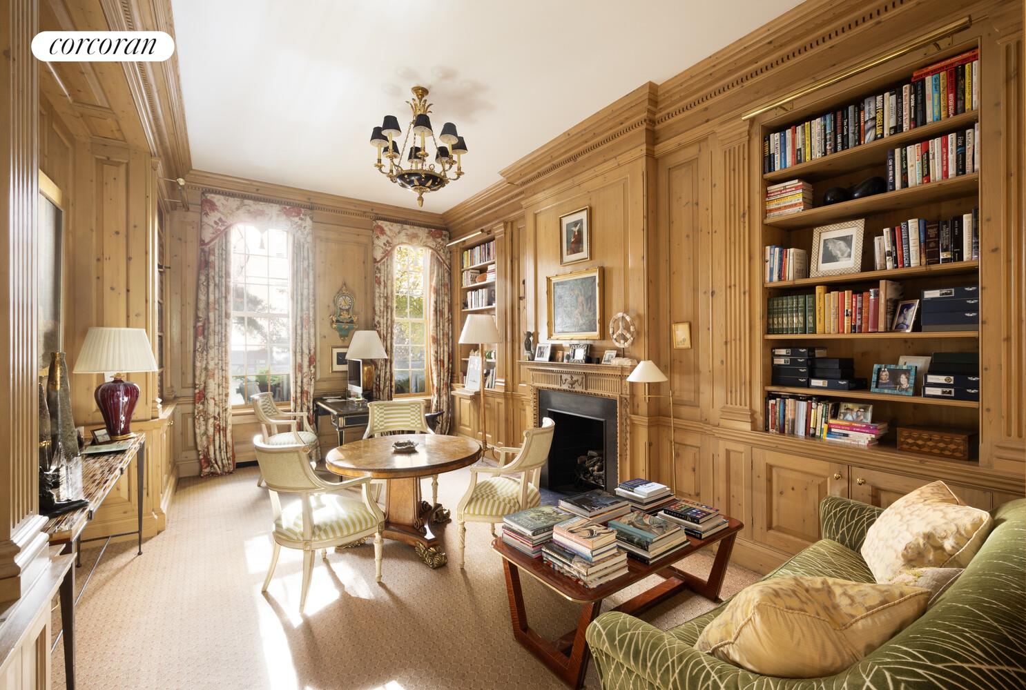The second floor is anchored by a furnished mezzanine that overlooks the garden level rooms. This flexible space lends itself to dramatic entertaining. On this floor there is also an elegant antique English pine-paneled library with floor-to-ceiling bookcases and a fireplace, as well as a lovely guest bedroom with ensuite bath.