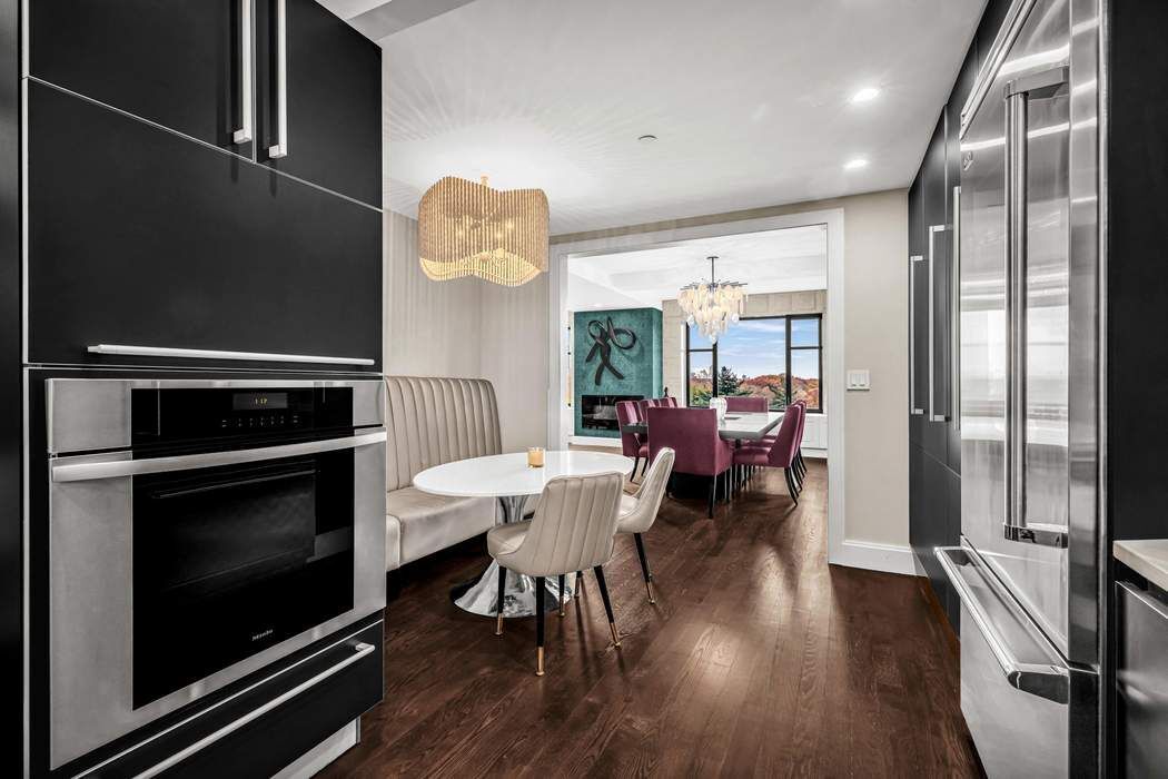 The sleek, spacious, eat-in kitchen with Central Park views, combines style and functionality with stone countertops, Miele and Viking appliances, a gas range, an additional mini freezer, and a built-in banquette perfect for casual dining.