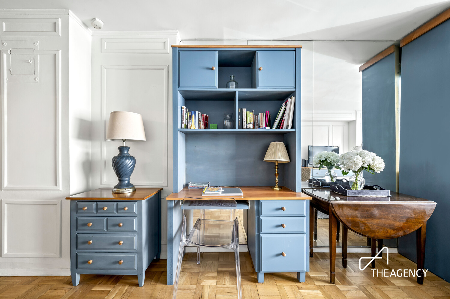 Beautiful reflected light highlights original blond solid wood parquet flooring and charming moulding details of this mid-century gem while a few key doors hide volumes of customized storage space. The flexible living space fits a desk, sleeper sofa, table, and murphy bed transforming from entertaining living space to bedroom in seconds.