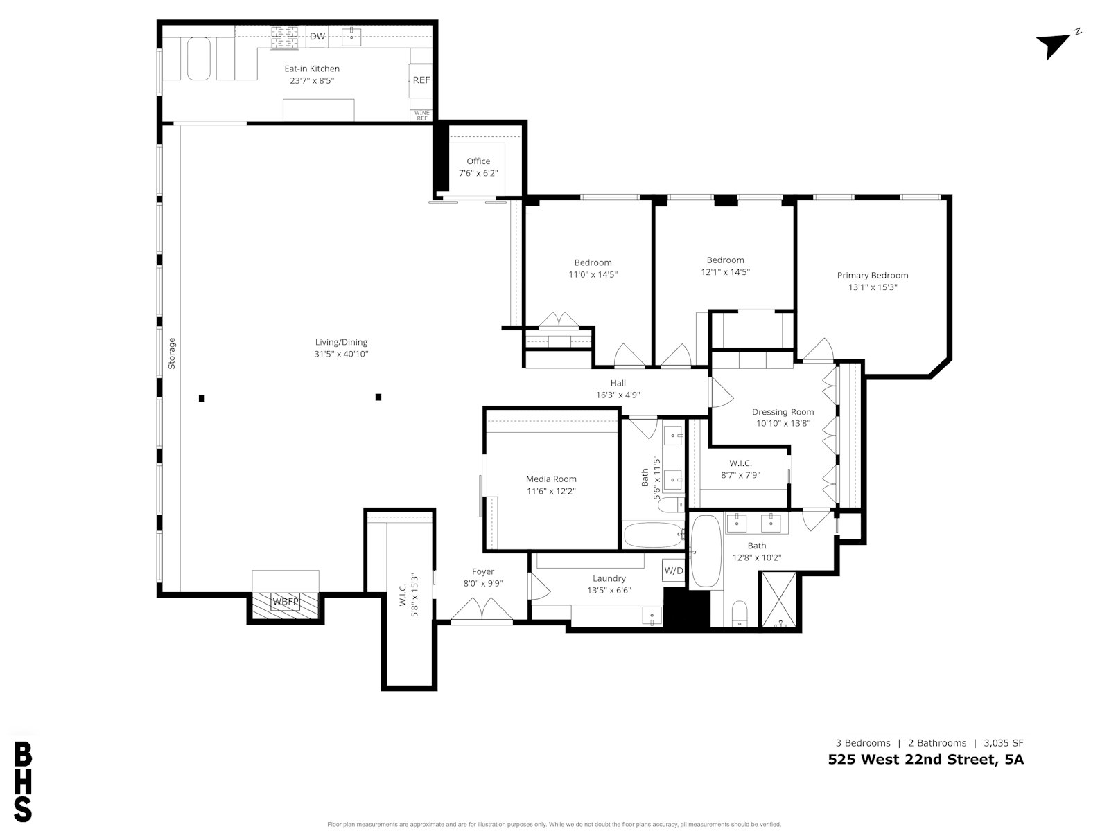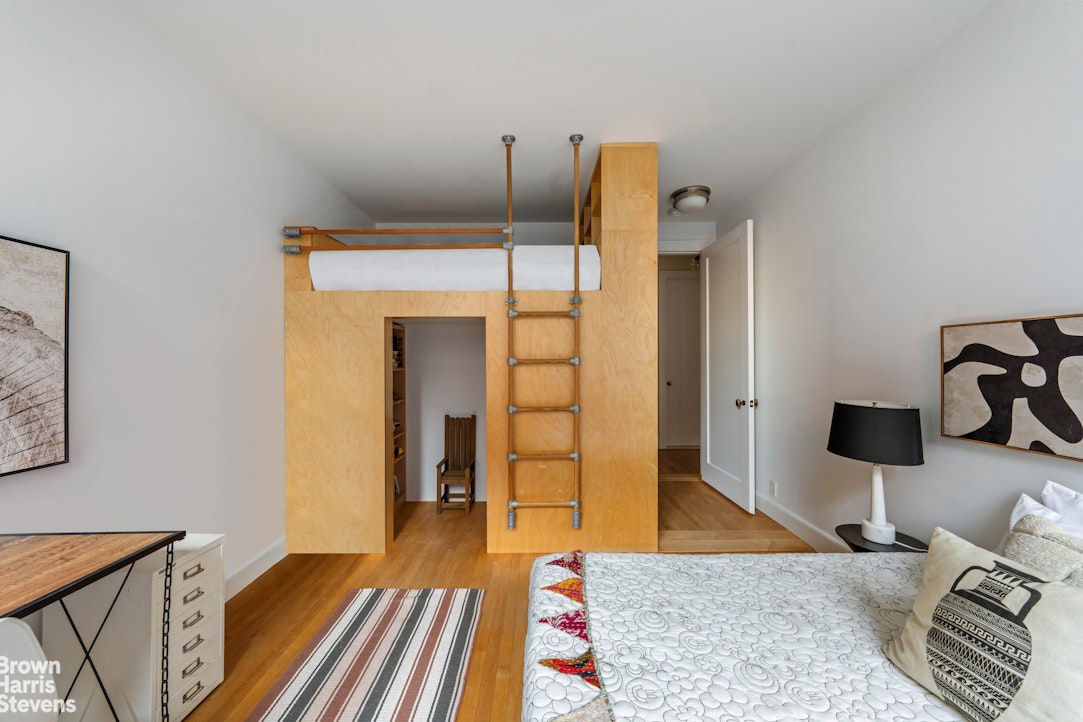 A long gallery-style hallway lined with bookshelves leads to the private bedroom wing. The primary suite is generously scaled with a walk-in closet in addition to a full wall of floor-to-ceiling closets in the dressing area - ensuring that living space is never compromised by storage. The second bedroom is cleverly designed with a lofted bed and integrated storage below, maximizing flexibility and function. A third bedroom and two full baths, both with double vanities, complete the wing.