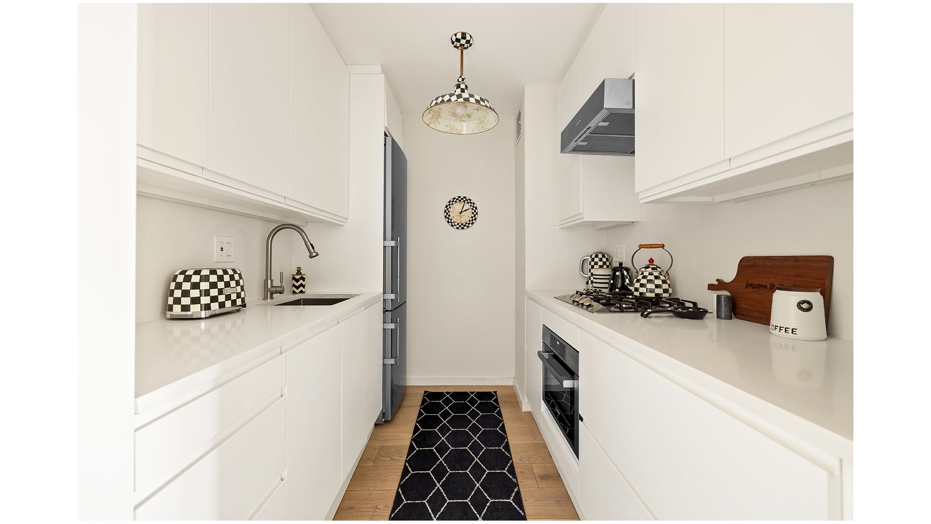 The beautifully renovated kitchen is outfitted with custom wood cabinetry and top-of-the-line stainless steel appliances, blending refined design with high performance.