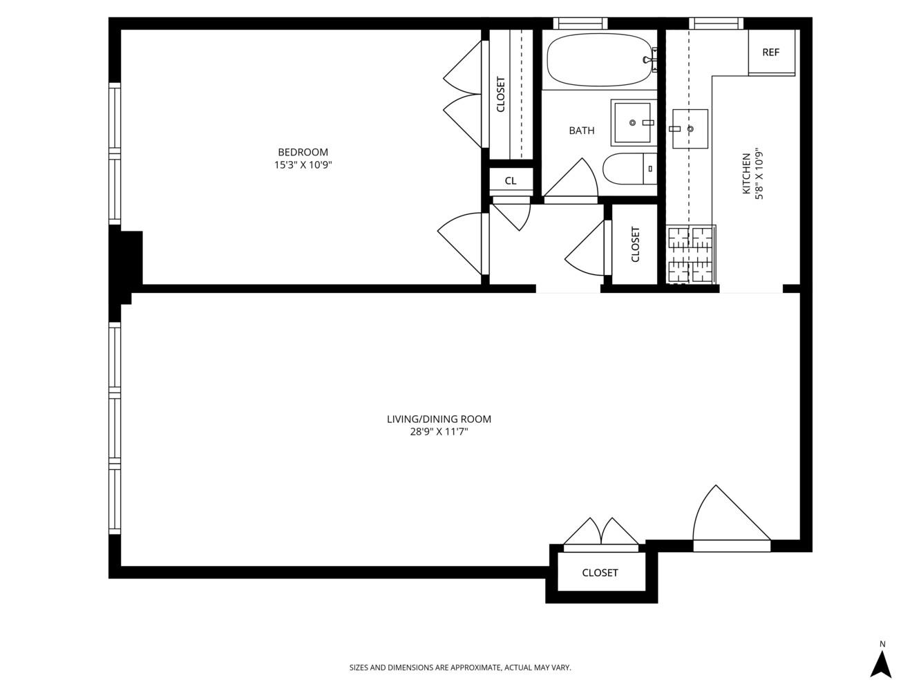 The king-sized bedroom offers an expansive feel and excellent natural light, while generous closet space throughout the apartment provide ample storage.