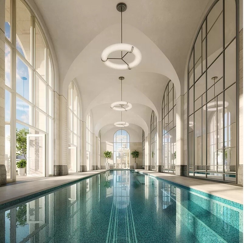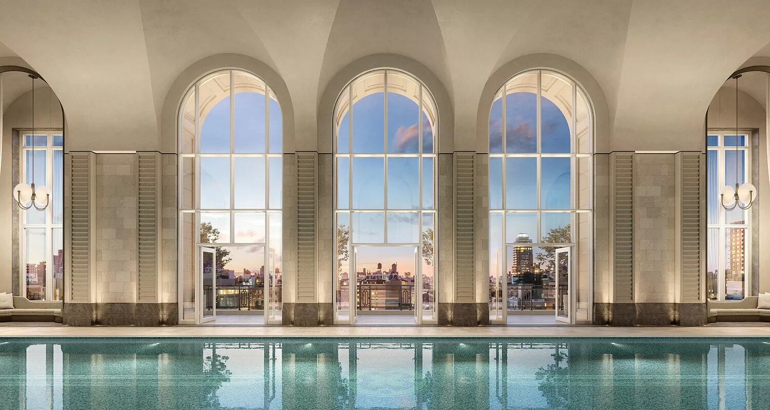 The tower's amenities include a seventy-foot swimming pool, a fitness center, yoga room, spa with steam bath and sauna, and a Winter Garden with a charming fireplace and dramatic loggia. At ground level, beyond the gates of the porte-coch re, is a concealed automated parking system with views of a landscaped private garden. An adjacent library and private cinema emphasize a dedication to fine materials and uncompromising attention to detail. A children's playroom and teen hangout room complete the amenities. The lobby is attended 24 hours a day with doorman and concierge service.