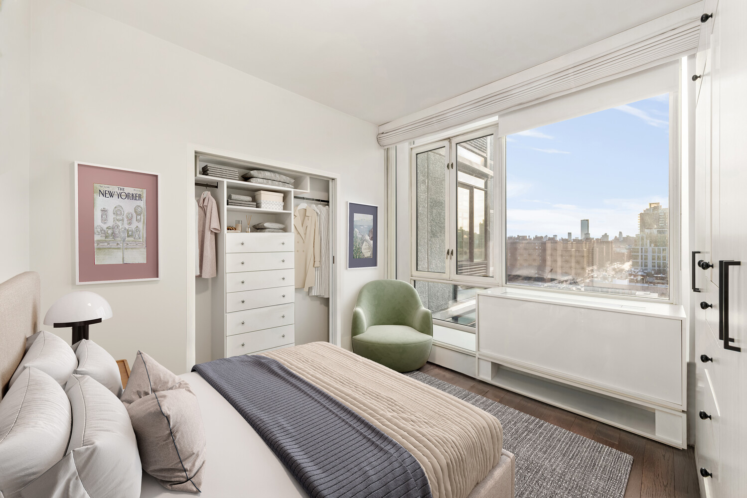 Perched high above the city, Residence 14A at 385 First Avenue is a stunning, sun-drenched sanctuary that perfectly captures the essence of modern Manhattan living. This meticulously maintained home features expansive floor-to-ceiling windows that frame breathtaking, unobstructed southern and western views of the iconic New York City skyline. The open-concept layout is anchored by beautiful wide-plank hardwood floors and a seamless flow between the living, dining, and kitchen areas, making it an ideal space for both quiet relaxation and entertaining.