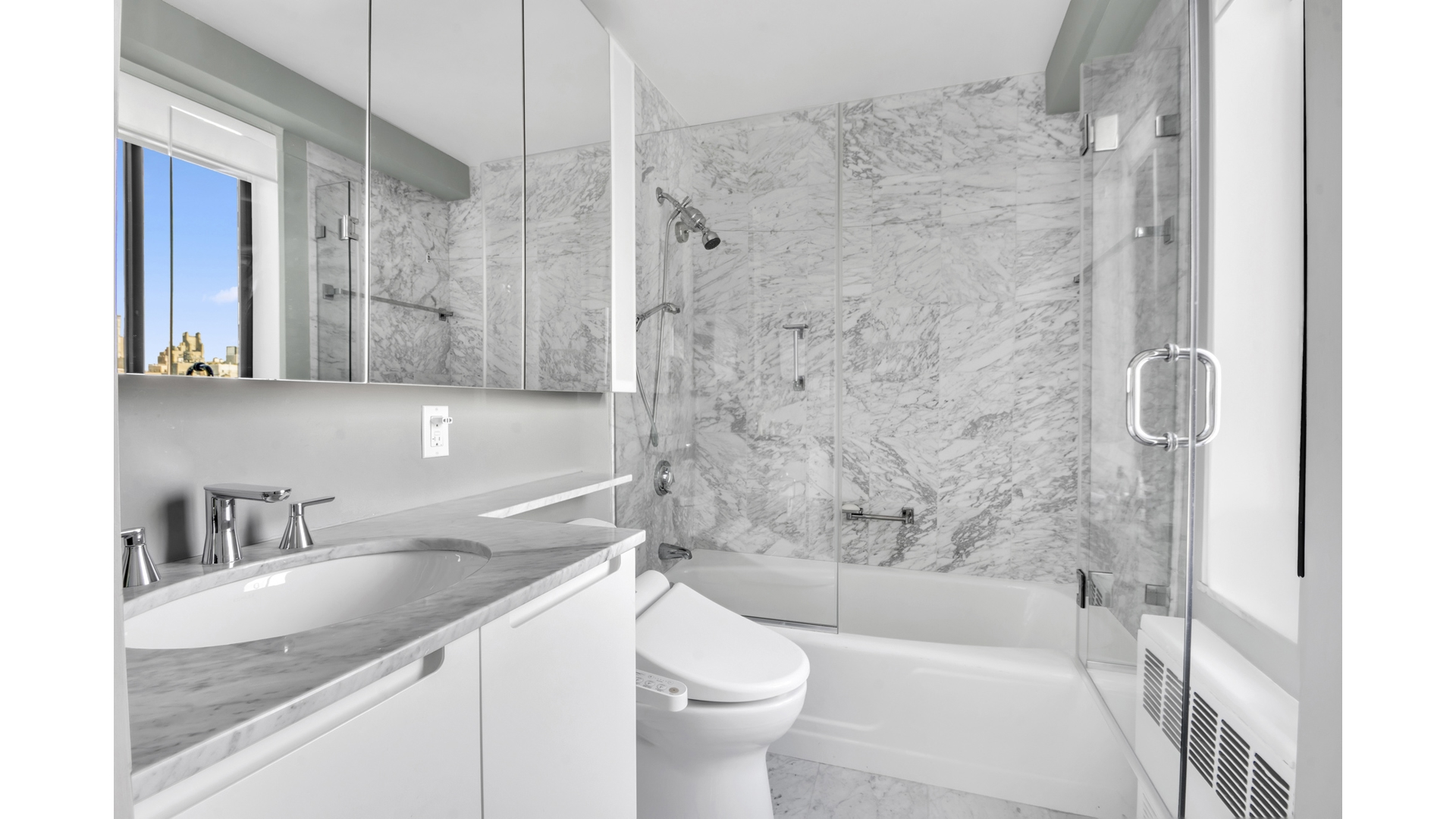 Both bedrooms are generously scaled and feature en-suite windowed marble baths. The primary suite is a serene retreat with four north-facing windows, expansive Upper East Side views, and a massive custom walk-in closet plus an additional closet. The second bedroom-ideal as a guest room or home office-also enjoys four north-facing windows, custom built-ins, and its own en-suite bath. Additional highlights include eight closets in total, Miele washer/dryer, beautiful hardwood floors and refined lighting throughout.