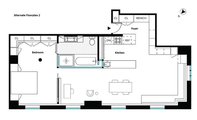 While currently configured as an open loft, the layout was intentionally designed to be easily adaptable, with the option to add a millwork partition with pocket doors to create a separate sleeping or work area-without sacrificing light, views, or circulation.