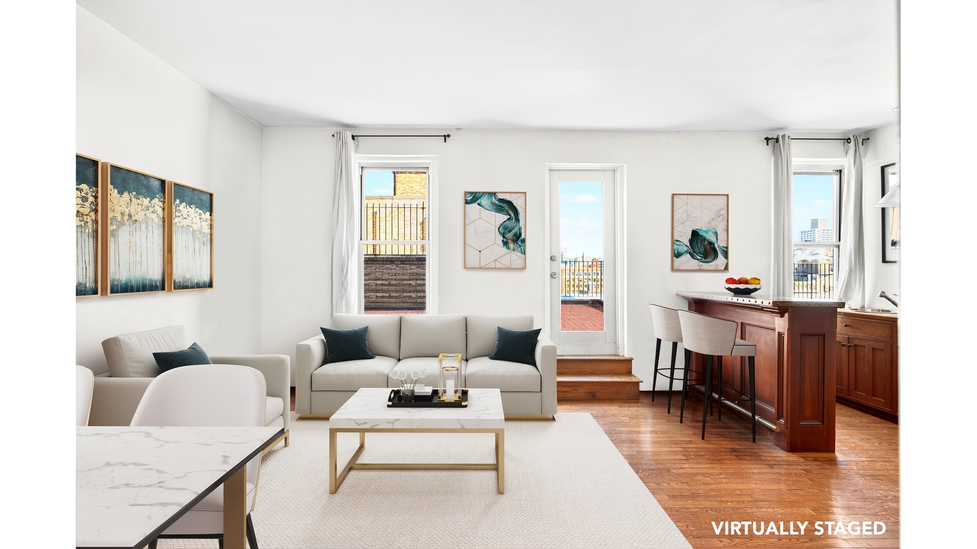 This perfect pied-à-terre one bedroom offers an open living/dining area, a windowed kitchenette with breakfast bar, a skylight in the bathroom, and a massive 850 sq ft terrace with open city views.