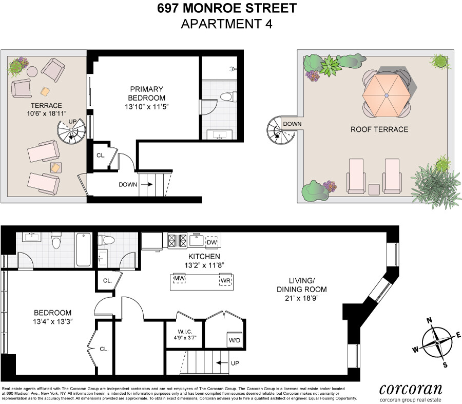With low real estate taxes and affordable common charges, there's a lot to love at the penthouse at 697 Monroe Street - the brightest unit with abundant outdoor space in this stylishly renovated four-unit brownstone condo on a tree-lined block in Bedford-Stuyvesant. This exceptional duplex unit combines modern luxury with thoughtful design, featuring two large bedrooms, two and a half bathrooms, an open kitchen, and a huge living and dining space filled with southern light. The flexible layout offers enough space to add a home office or third bedroom.
