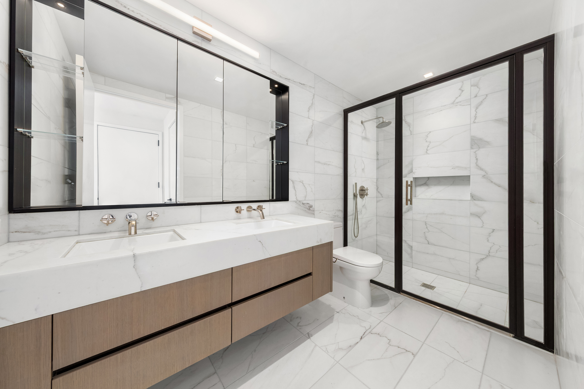 The main level is dedicated to living and sleeping, thoughtfully laid out for both comfort and functionality. A generous living and dining area is framed by oversized windows and finished with wide-plank European oak floors. The open kitchen is both elegant and highly functional, featuring custom Italian cabinetry, honed Dolomiti marble countertops, and a full suite of Miele appliances including a gas cooktop, oven, speed oven, dishwasher, and refrigerator.