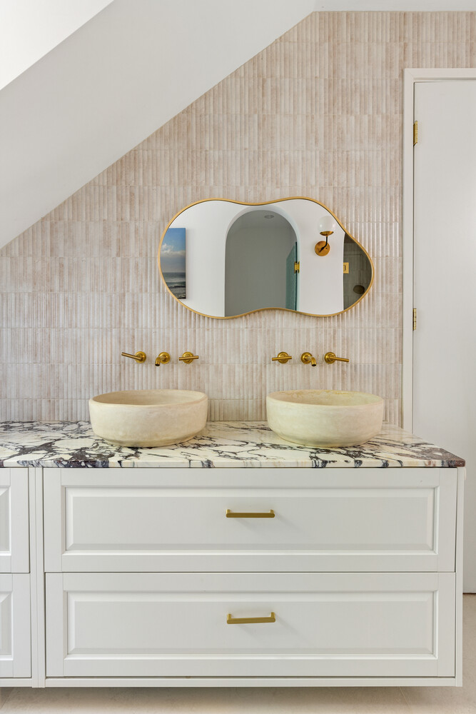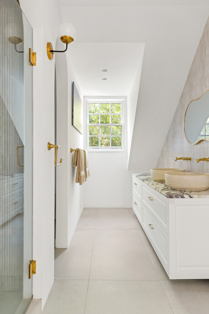 The main house spans approximately 3,357 square feet across four levels, offering 4 bedrooms, 4.5 bathrooms, two offices, a music room, and a playroom. A garden-level extension creates seamless flow between the kitchen, dining, and living spaces, anchored by a sculptural custom staircase by New York Stairs. Bathrooms are finished with arched transitions, handmade tile, and spa-like detailing.
