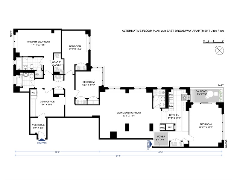 • Spanning over 2,100 square feet, this expansive three-bedroom, three-bath residence offers the scale and flexibility rarely found at this price point. Currently configured as three bedrooms with a separate den, the home offers a layout that can adapt easily to different needs over time. What sets this home apart is its layout. The apartment is thoughtfully divided into two distinct wings, creating a natural separation between entertaining and private living. The southern wing is dedicated to gathering, with over 1,000 square feet of open living, dining, and kitchen space. The kitchen integrates seamlessly into the room and is equipped with a full suite of premium appliances, including a five-burner stove, double sink, two dishwashers, and wine refrigerator. It is a space designed to actually live in, not just look at. The northern wing, spanning over 1,100 square feet, offers true privacy. The primary suite is quietly set apart, alongside two additional bedrooms and a flexible bonus room that can adapt to a range of needs, from workspace to guest accommodations. All three bathrooms are windowed, a rare and meaningful detail. A private balcony framed by mature trees brings a sense of calm that feels removed from the city. Additional features include an in-unit washer and dryer and exceptionally low monthly maintenance of $2,858. A gracious entry foyer creates a strong sense of arrival, while a secondary mudroom-style entrance adds everyday practicality. Residents of Seward Park Cooperative enjoy a full suite of amenities including a 24-hour attended lobby, fitness center, private parks, and on-site management. Located moments from Essex Crossing and major subway lines (F, J, M, Z), the building is surrounded by some of downtown’s best shopping, dining, and conveniences.