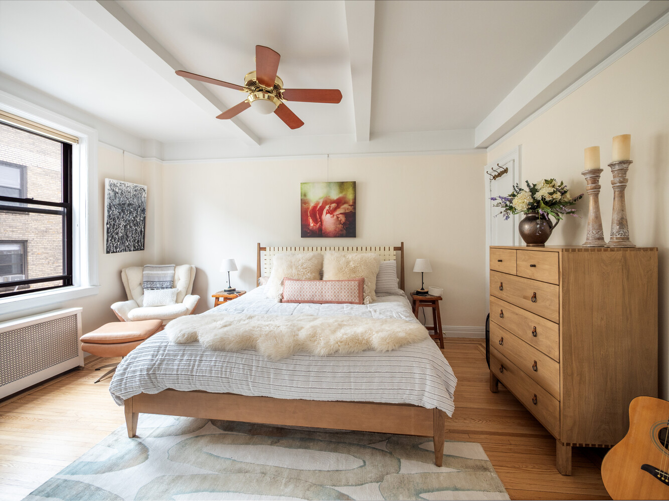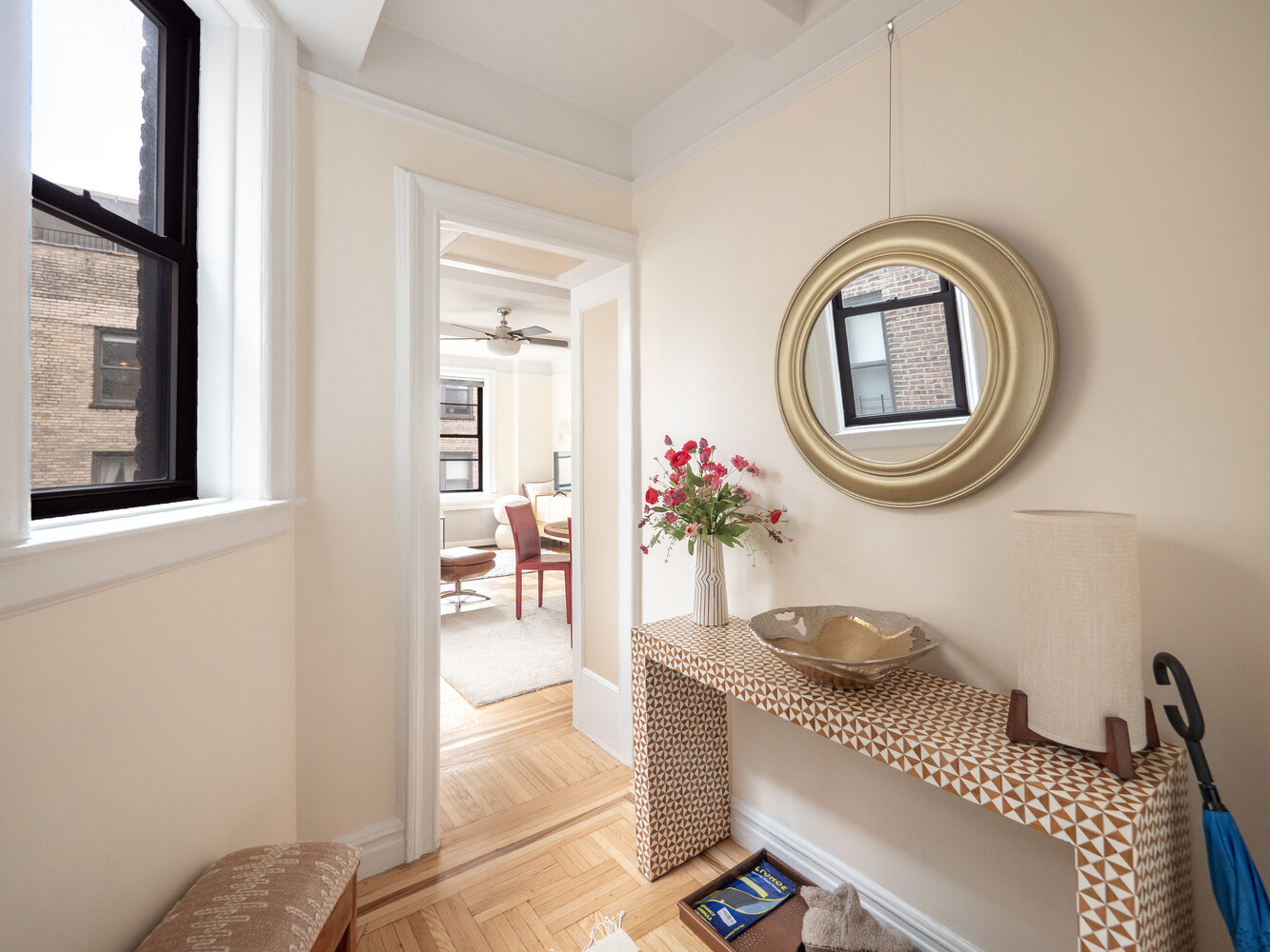A rare opportunity in the heart of Lincoln Square, this inviting and well-proportioned one-bedroom offers classic Upper West Side charm just moments from Central Park. With a bright southern exposure, the home is filled with natural light and showcases beautifully preserved prewar details, including beamed ceilings nearing nine feet and multiple oversized windows that enhance the sense of space.
