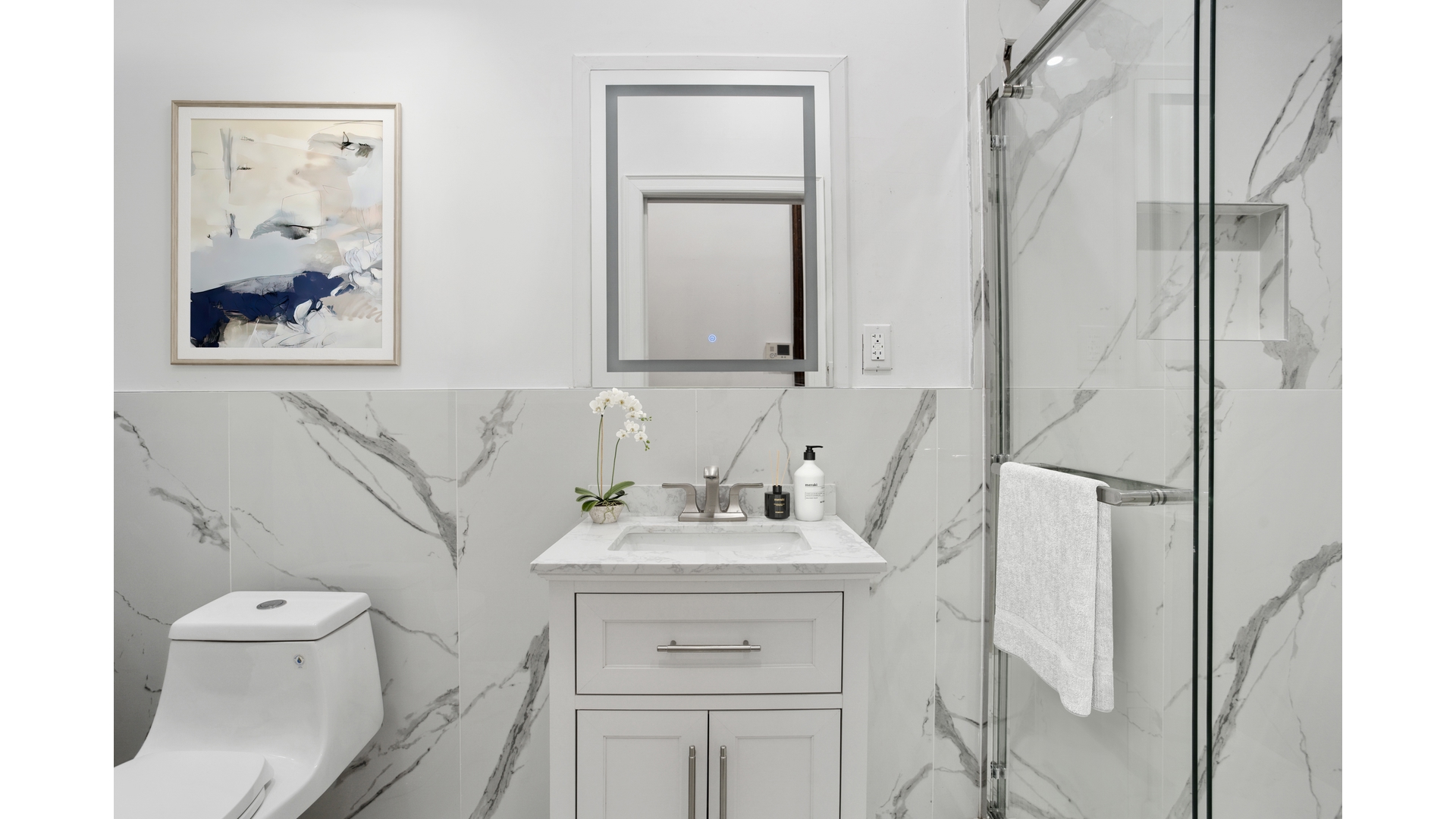 Off the main entryway is the second bedroom which is generously sized with excellent closet space. Perfectly situated near the second bedroom and the living area is a sleek full bath with beautiful porcelain tiles and a rain shower.