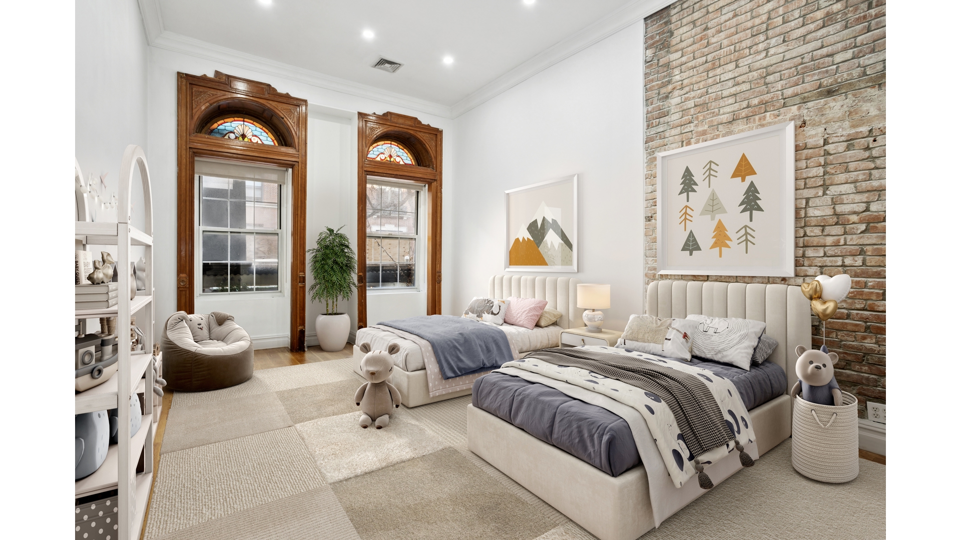 • This amazing loft-inspired residence with 2 large bedrooms and 2 full baths rests on the parlor floor of a handsome double wide 1895 brownstone located just one block from Central Park! Exceptional features like stunning exposed brick walls, rich hardwood floors, elegant moldings, beautiful wood trim, stained glass accents, 12' ceilings with decorative fireplaces, grace the massive 2,500 square foot apartment, complete with a private terrace.