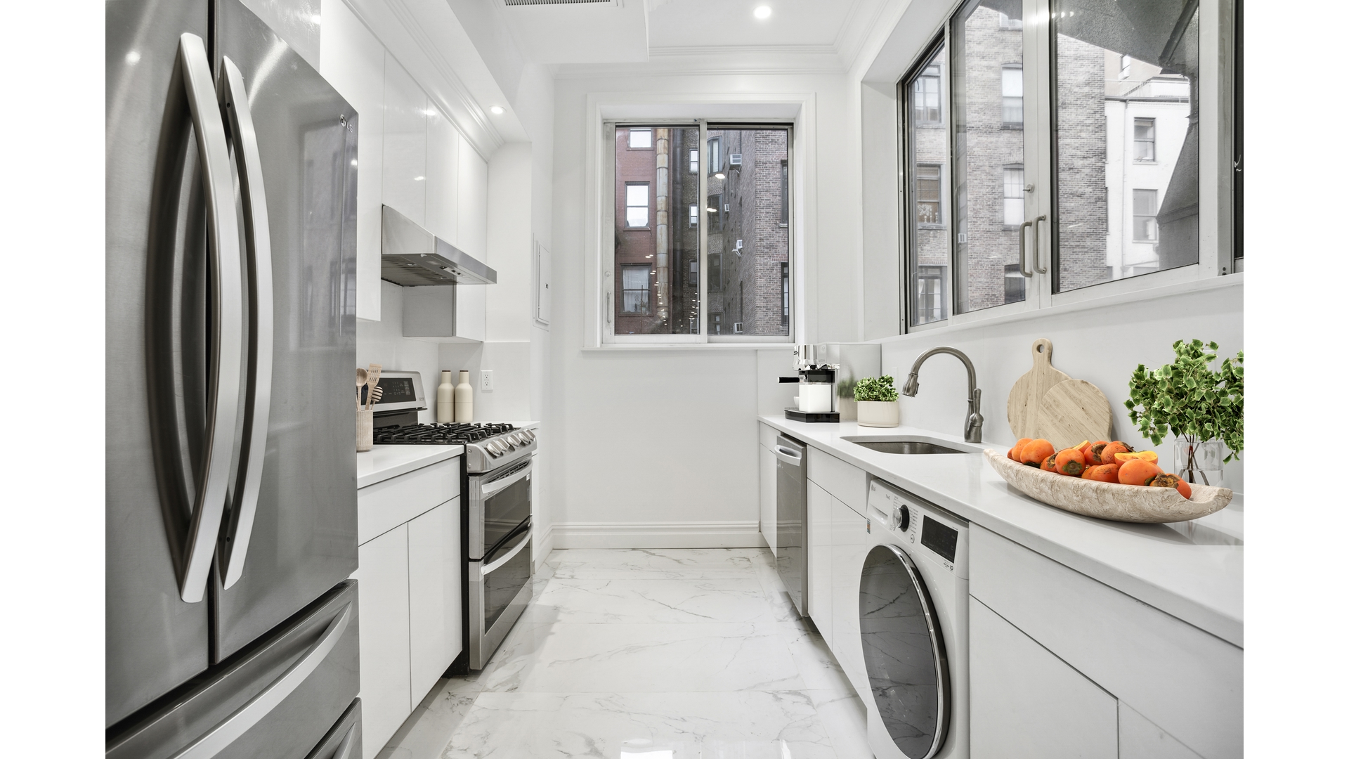 The entryway has a beautiful exposed brick archway that leads into an enormous open living/dining/entertaining space that can accommodate large gatherings, multiple seating arrangements, and a variety of needs. The living room can easily be divided up to accommodate a 3rd bedroom which would be built by the front facing bay windows. Off the dining area is a contemporary windowed kitchen styled with white cabinetry, countertops and porcelain floors, stainless steel appliances, and a convenient washing machine. Double doors open to a huge terrace for enjoying cocktail parties, alfresco dining and lounging outdoors.