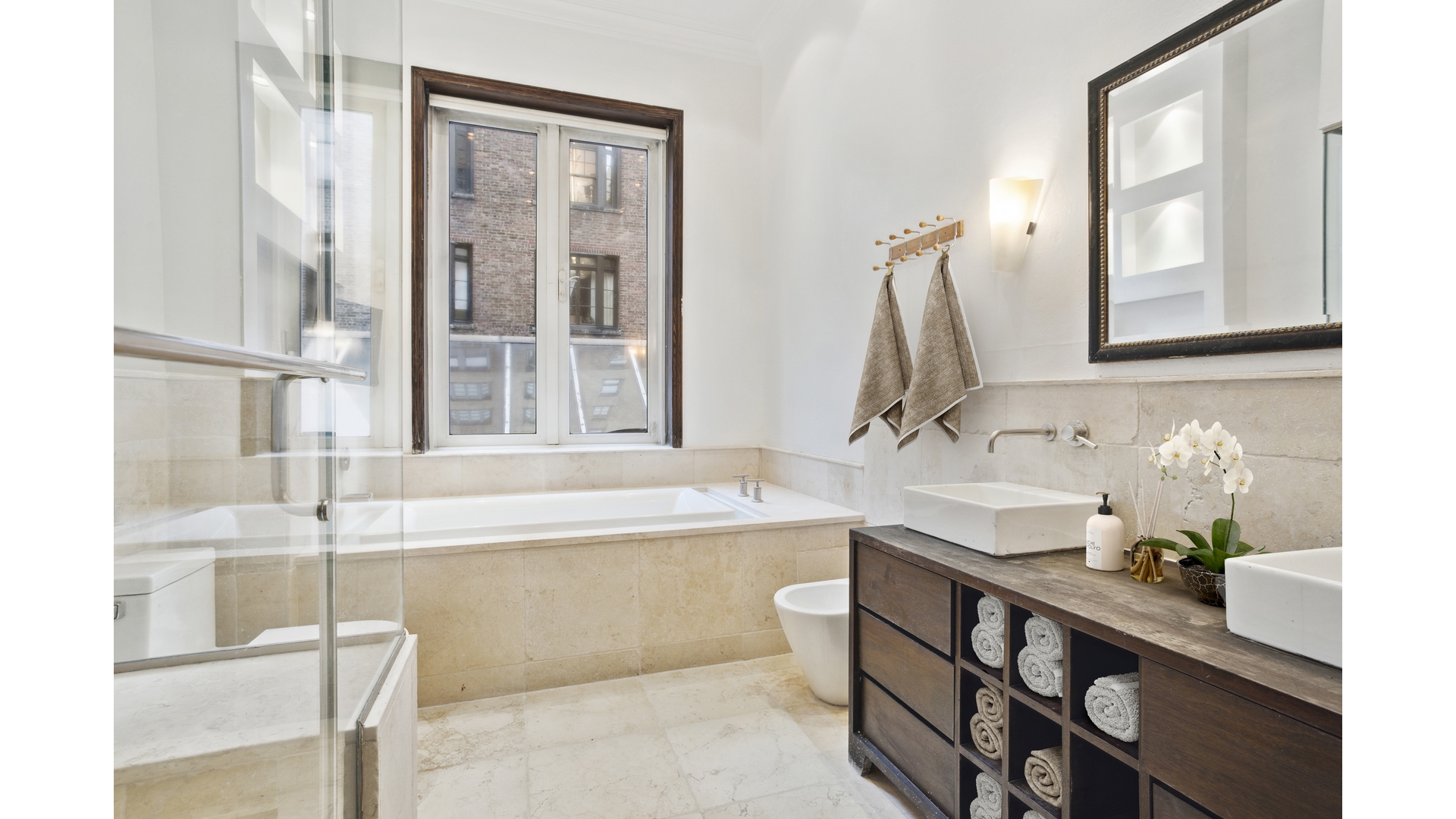 The primary bedroom is a private retreat with oversized windows and spacious closets and it can be accessed from the buildings entry foyer. The lovely en-suite windowed bath features a soaking tub, separate glass-enclosed shower, 2 vessel sinks, and a wood vanity with ample storage.