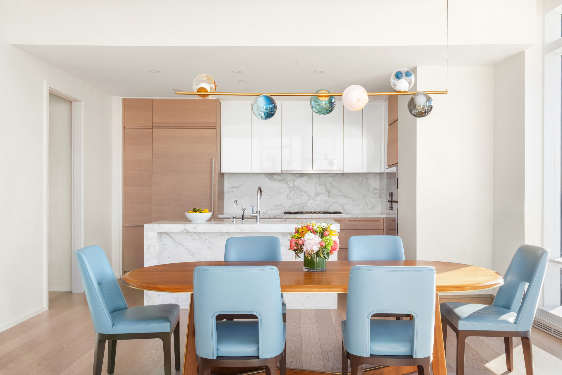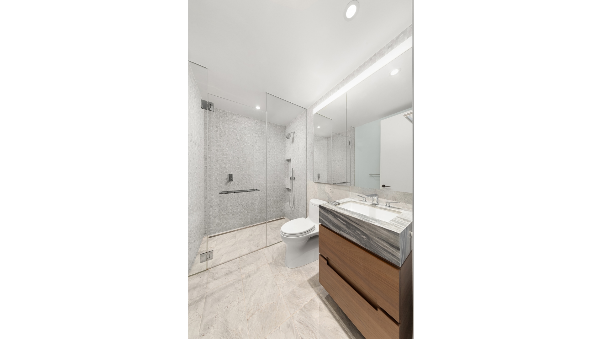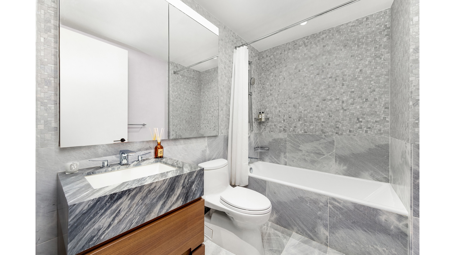 One of only six four-bedroom residences in the building, the home features soaring ceilings and thoughtful upgrades throughout, including custom millwork in the living room designed for both entertainment and additional storage, as well as bespoke millwork in the primary bedroom suite. Custom closets have been installed in every bedroom, and motorized shades are featured throughout the home for both comfort and convenience.