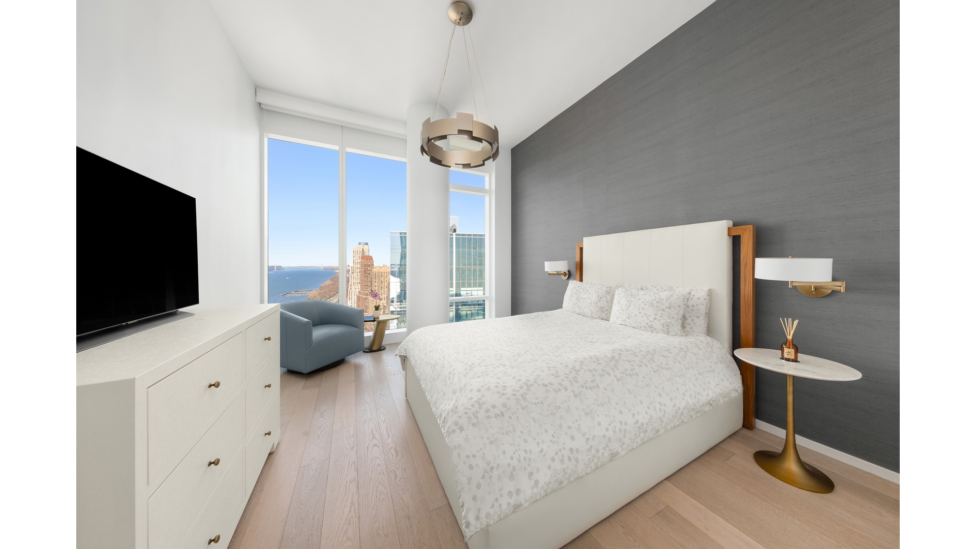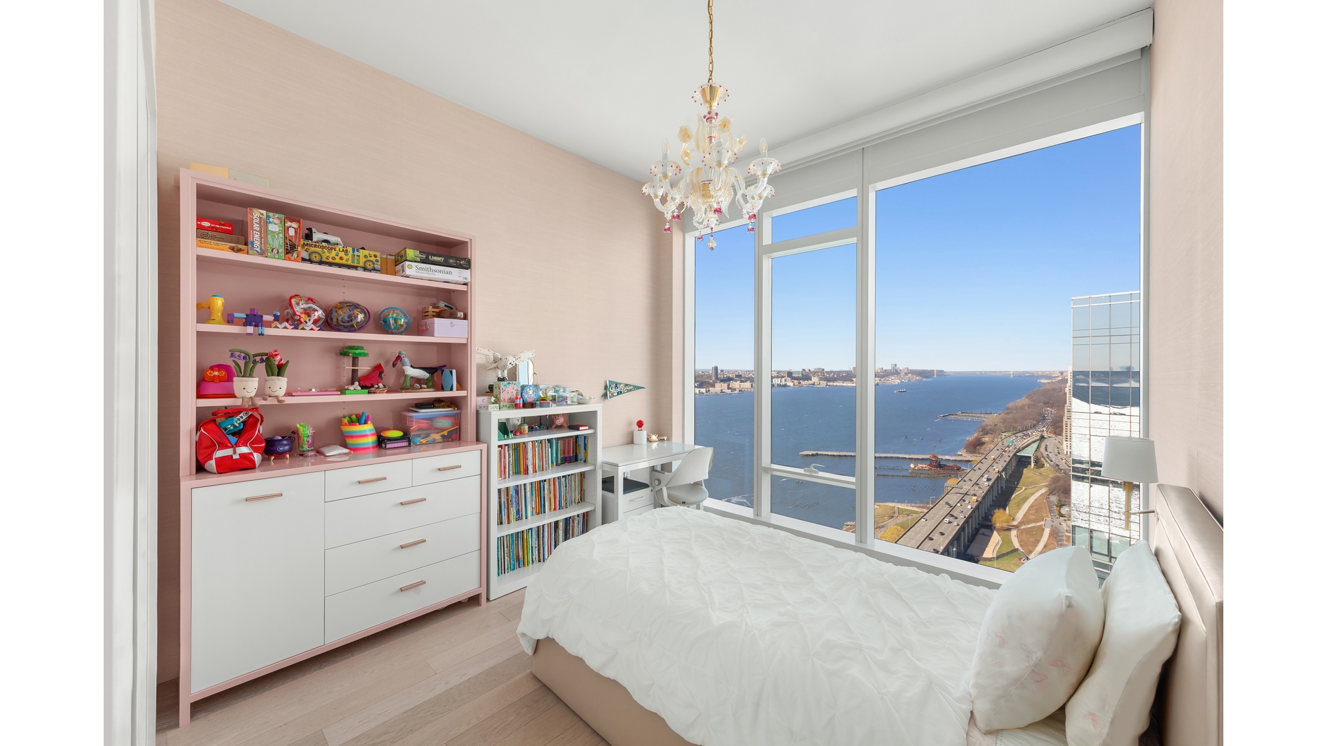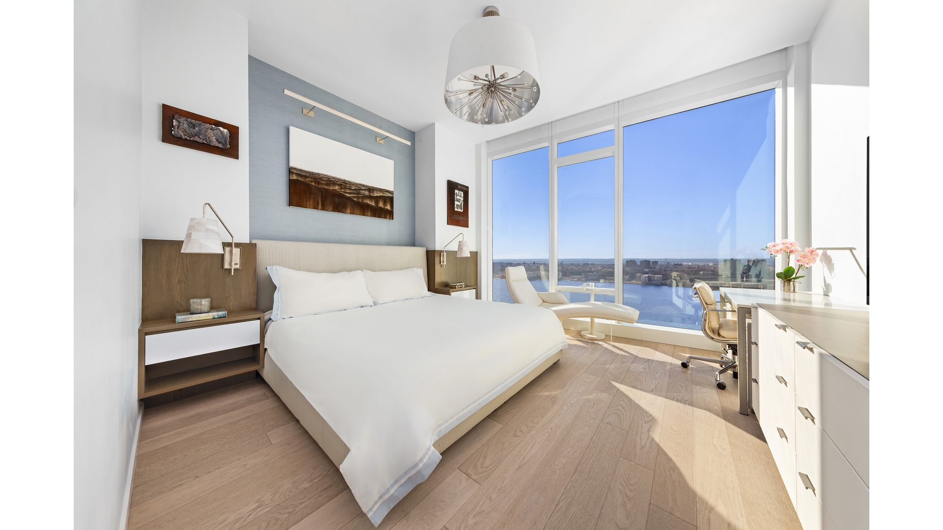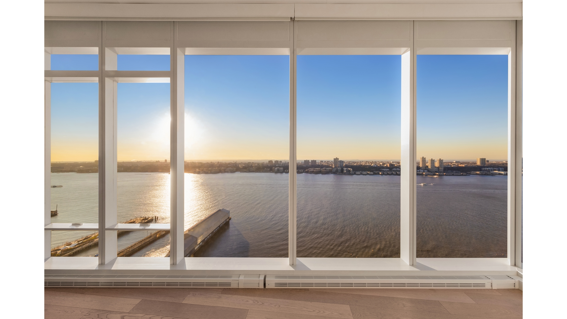 Capturing sweeping views of the Hudson River to the west and the George Washington Bridge to the north, this exceptional four-bedroom, four-and-a-half-bathroom residence at Two Waterline Square is framed by floor-to-ceiling windows in every room, filling the home with natural light and delivering spectacular sunsets over the river .