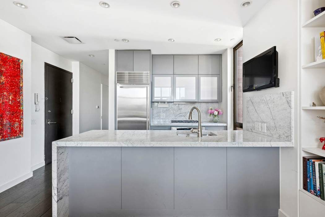 Positioned in the building’s prized A line, the home enjoys expansive eastern and northern exposures, with unobstructed skyline and bridge views from the main living and dining room. A wall of architectural windows and 10-foot ceilings bring in natural light throughout the day, giving the residence a bright and open feel from the moment of entry.