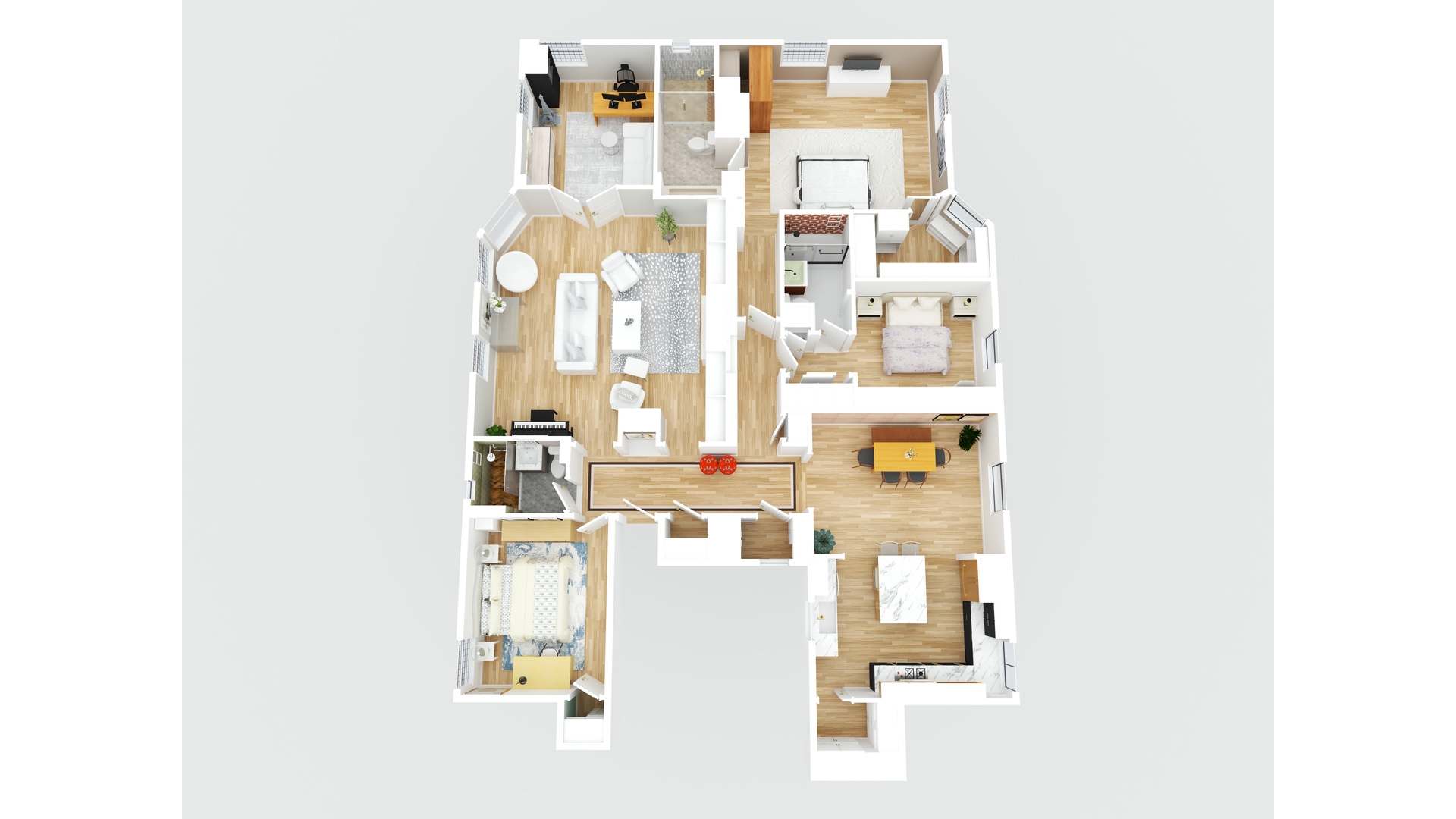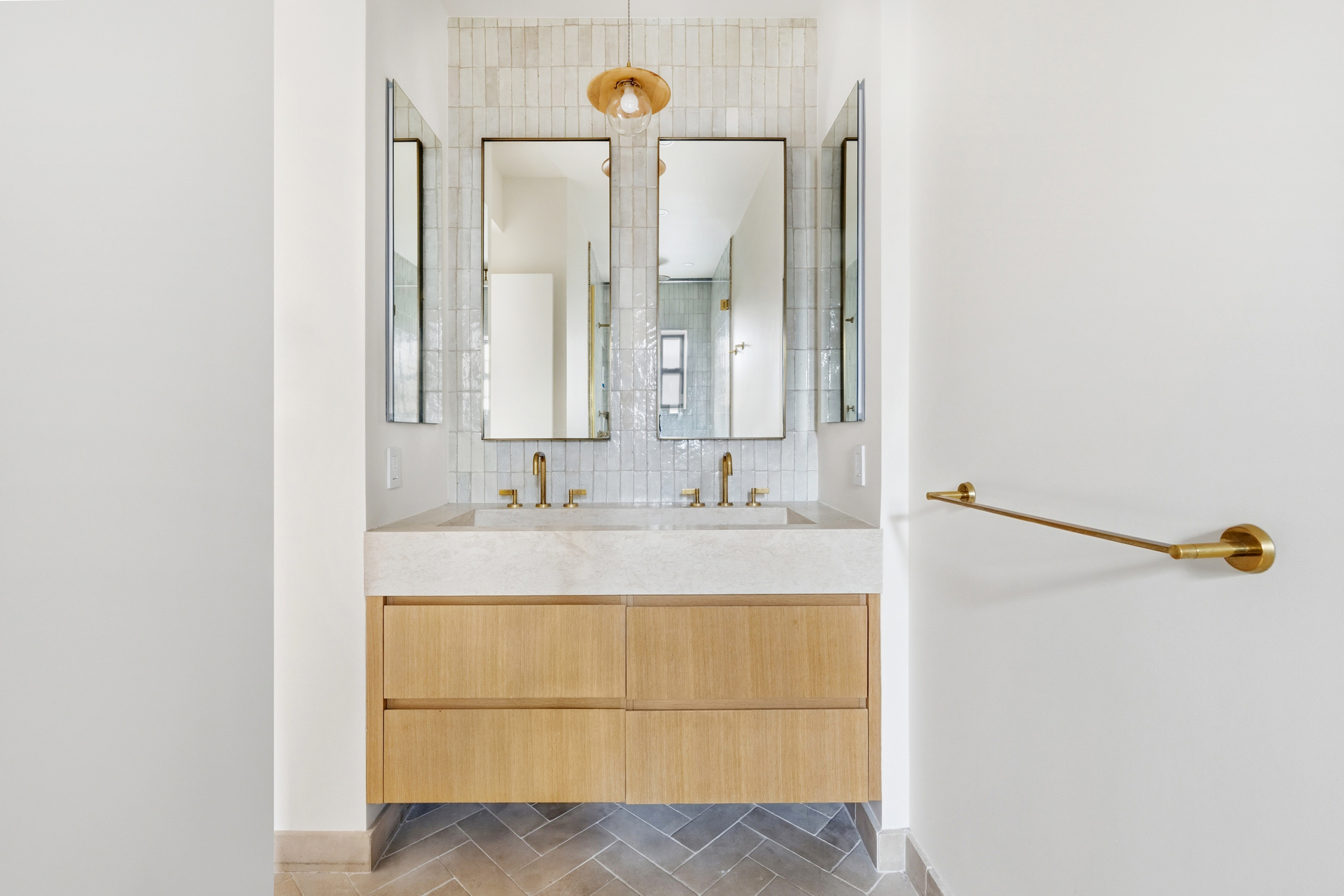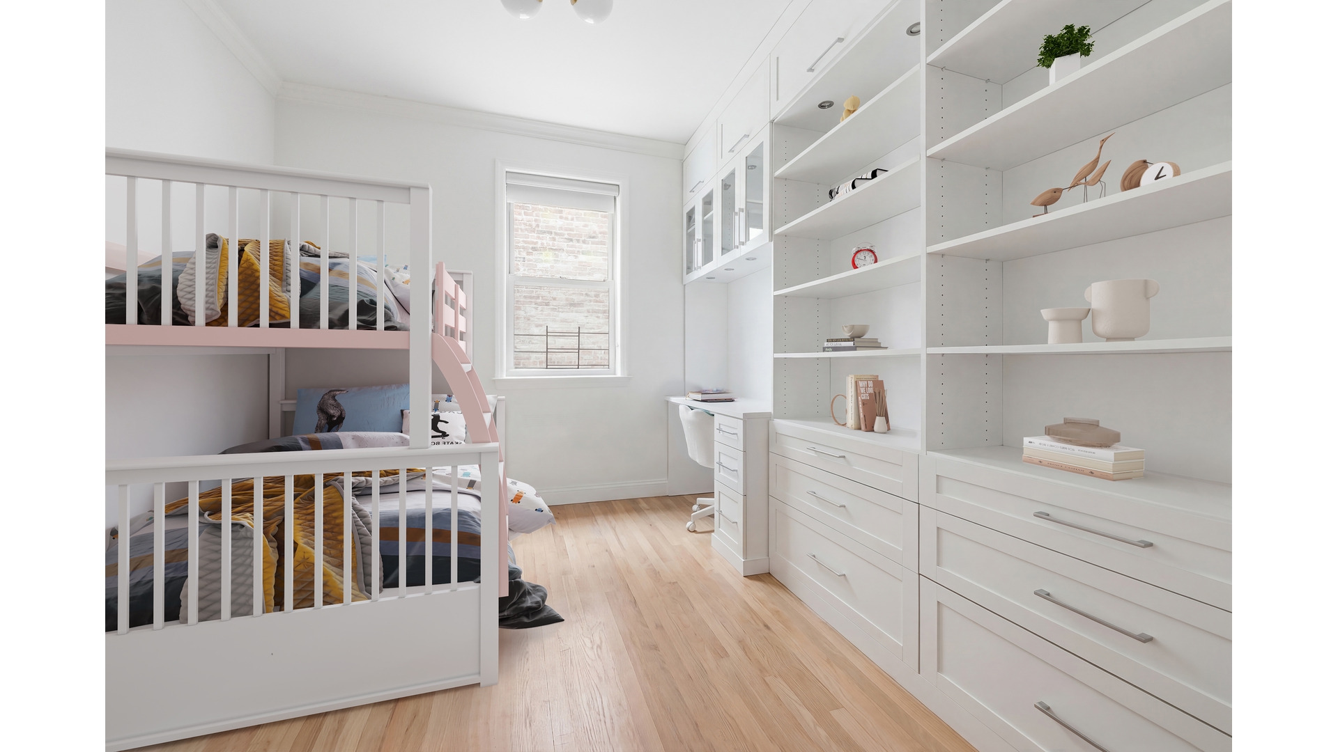 The primary suite is a serene retreat, gracious in scale to accommodate a king-sized bed, and complemented by a large walk-in closet and a spa-like en-suite bath with radiant heated floors. Throughout the residence, wide-plank white oak flooring, upgraded windows, custom closets, and light-filtering shades create a cohesive sense of warmth and understated sophistication.
