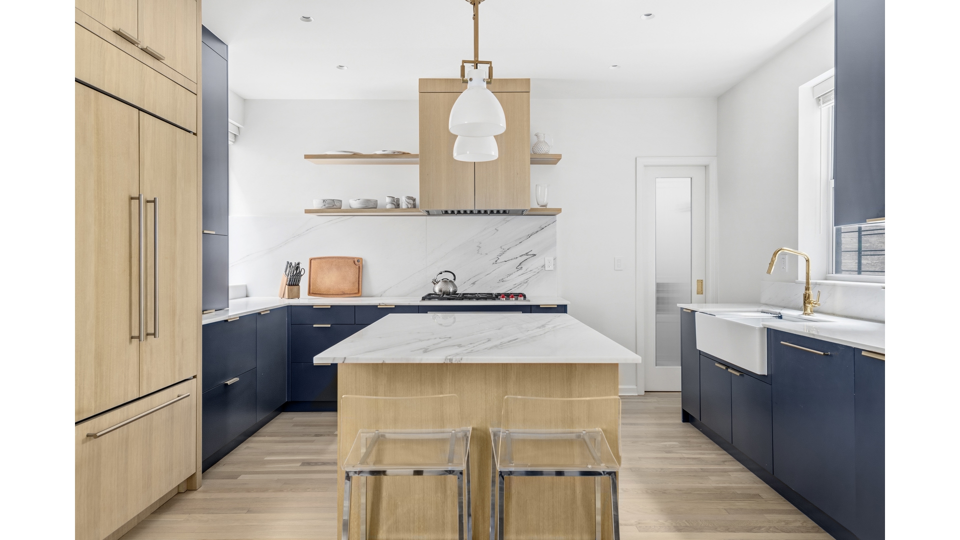 The chef's kitchen is a statement of craftsmanship and performance, featuring bespoke cabinetry, honed marble countertops, and a suite of premium appliances, including a Wolf gas range and Sub-Zero refrigerator. A generously proportioned walk-in pantry enhances both form and function, while the layout is ideal for everyday living and entertaining