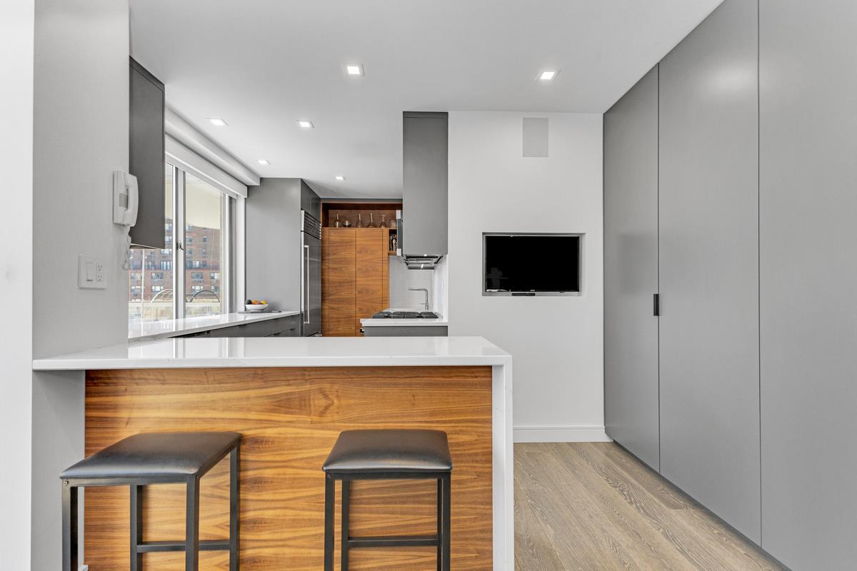 The windowed kitchen is well-appointed with selenite countertops, a Sub-Zero refrigerator, Viking range, Bosch dishwasher, and ample cabinetry. A full-size Bosch Washer and Dryer adds a level of convenience not often found in similar apartments.