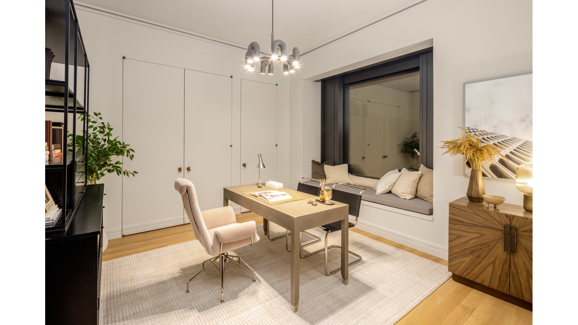 The primary suite offers south- and west-facing views; multiple closets including one walk-in; and spa-like ensuite bathroom that blends tradition and originality. Elegantly appointed in polished Noir St. Laurent marble, high-honed Verona limestone, and polished Persian golden travertine with polished nickel Dornbracht fixtures throughout, the primary bathroom features two separate vanities with custom Thierry Despont-designed polished nickel automated mirrors, a cast iron Lefroy Brooks soaking tub, freestanding shower, radiant heated floors, and private water closet. Two additional bedrooms-one facing north and the other south-each offer an en suite bathroom clad in high-honed Verona limestone with polished nickel Dornbracht fixtures. Completing the residence is a beautifully appointed powder room and a discreet utility closet with washer and vented dryer. No detail has been overlooked, from the custom interior lighting designed by Thierry Despont in collaboration with Schwinghammer, to the motorized Lutron solar shades with additional blackout shades in select locations, to the supply of humidified and filtered fresh air throughout the home.
