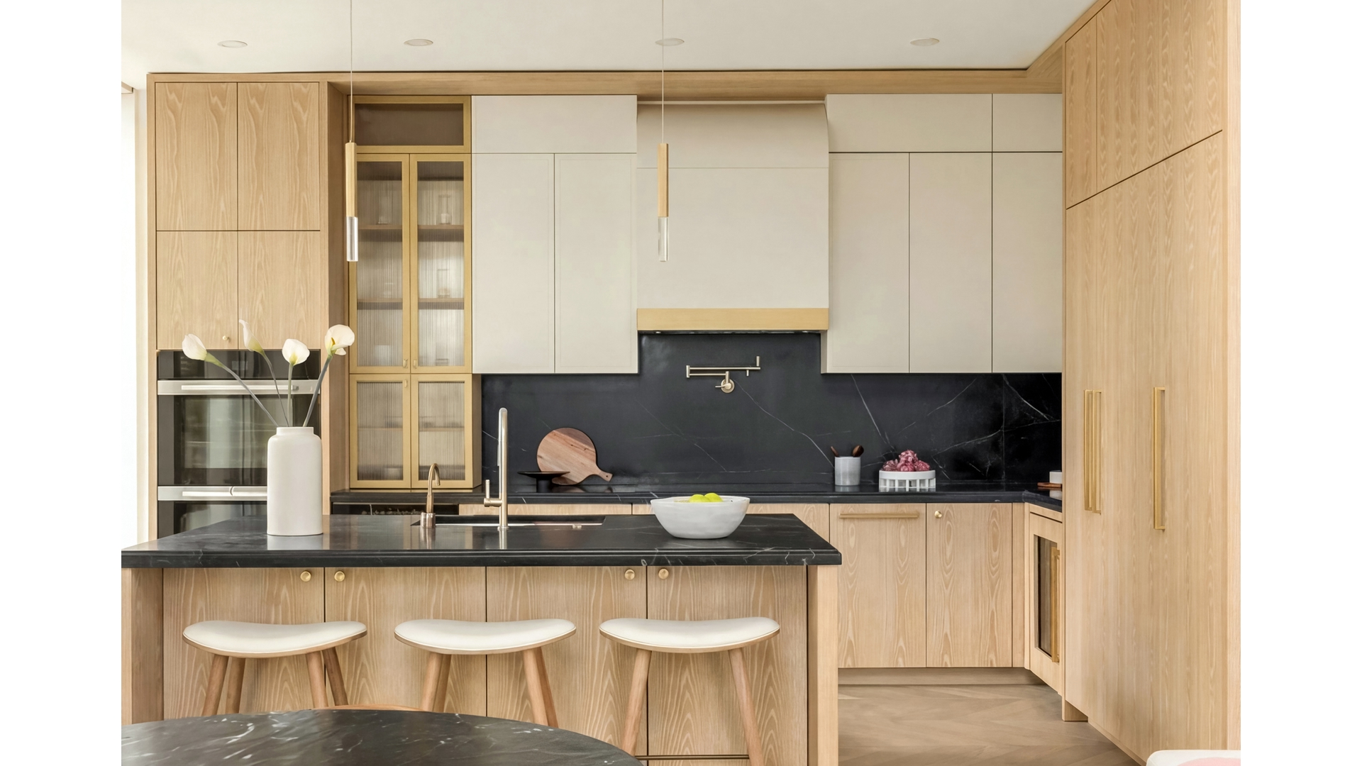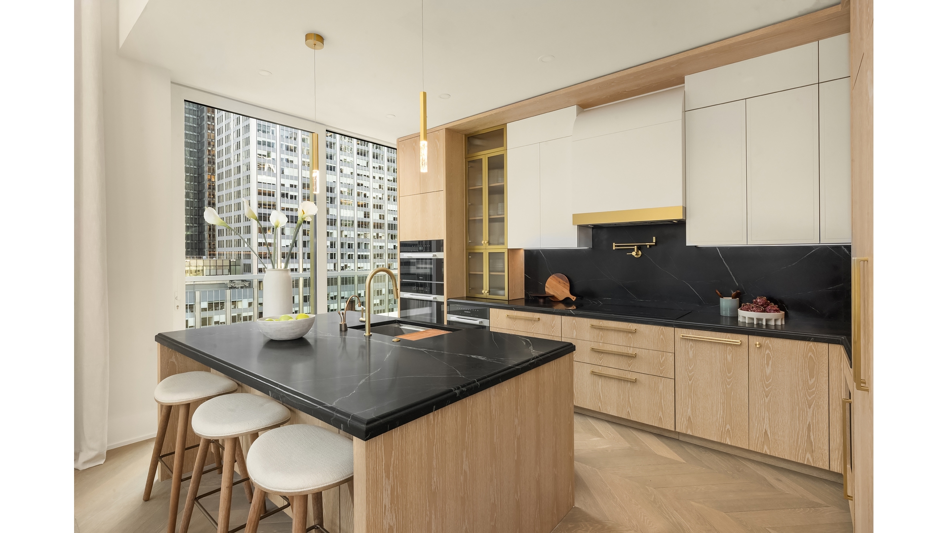 The windowed chef's kitchen is outfitted with a premium, fully integrated suite of Miele appliances - including a cooktop, convection oven, refrigerator, wine refrigerator, microwave, and dishwasher - alongside an integrated ventilation hood by Bosch. Custom white oak cabinetry, accented with satin brass hardware and under-cabinet lighting, is complemented by honed Brazilian Grey soapstone countertops and matching backsplash.