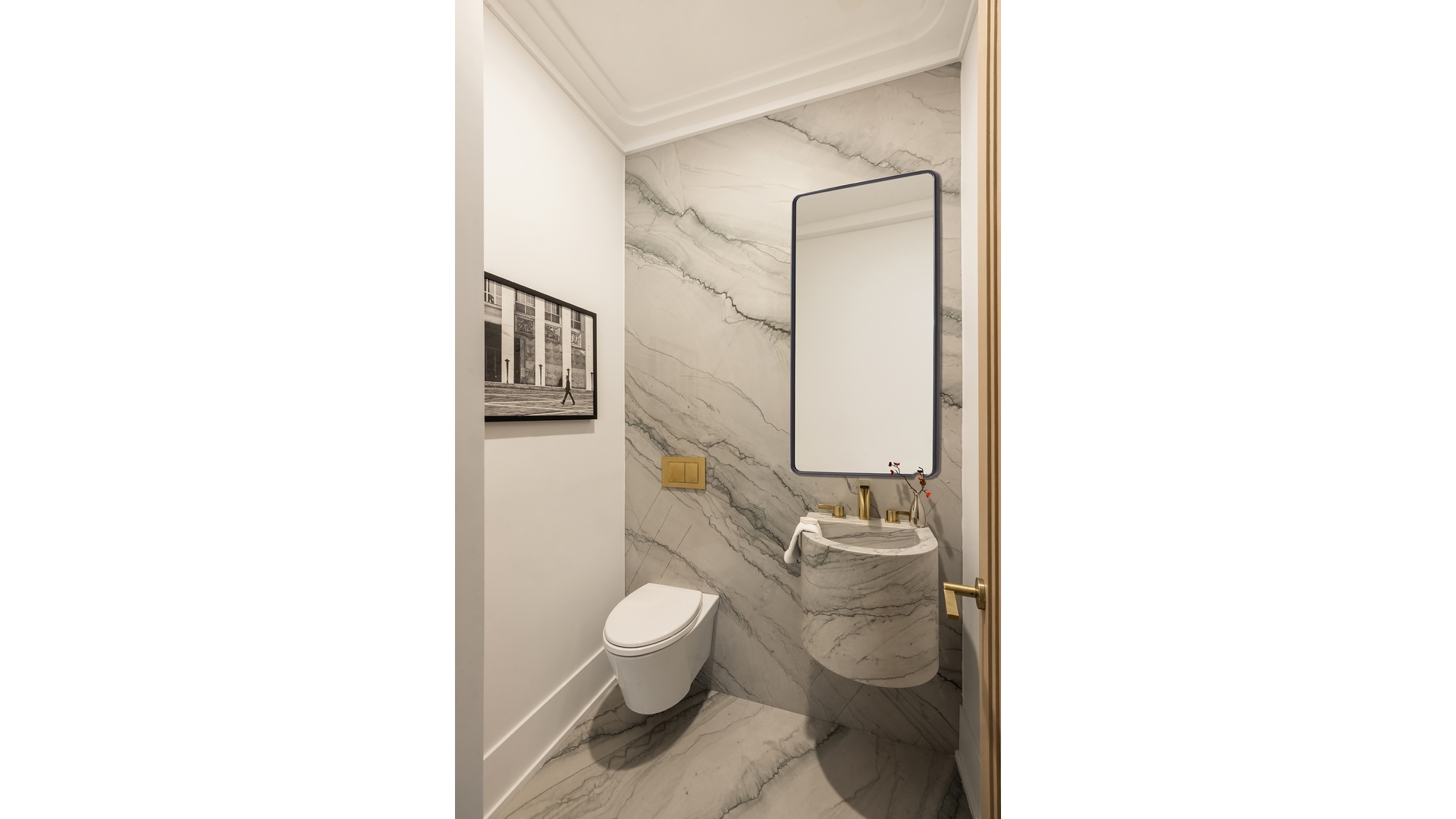 The primary suite features spacious walk-in and linear closets, as well as a five-fixture windowed primary bath. Clad in glazed porcelain tile and honed Calacatta Vision marble, the primary bathroom includes a dual white oak vanity topped with marble and flanked by custom sconces. Additional highlights include a freestanding Apollo soaking tub and a spacious shower with a Calacatta Vision marble feature wall and fluted glass enclosure.