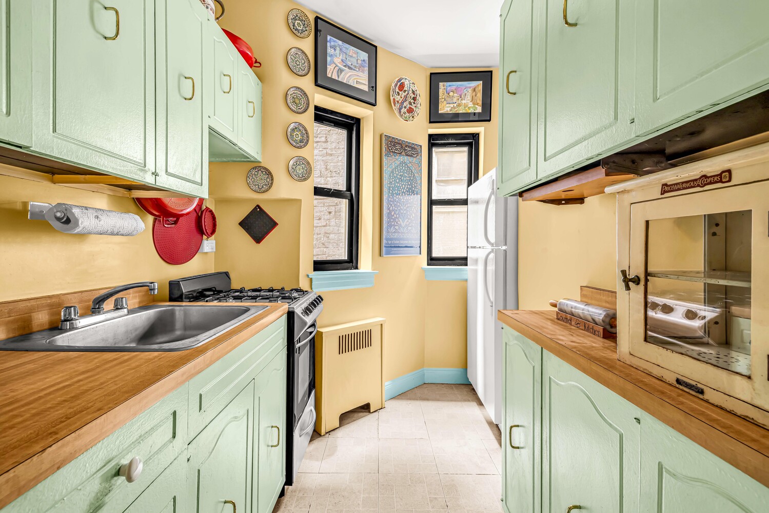 The living room is generously sized and flexible. The corner bedroom, with two exposures, comfortably accommodates a king-size bed and workspace. A windowed kitchen and bath, along with three closets-including a designated space for an in-unit washer/dryer-complete the home. Well maintained over time, the apartment offers an opportunity to personalize while preserving its classic prewar charm.
