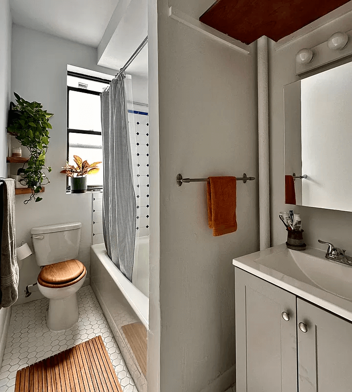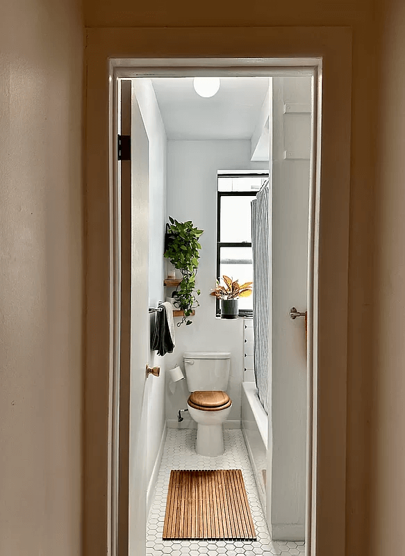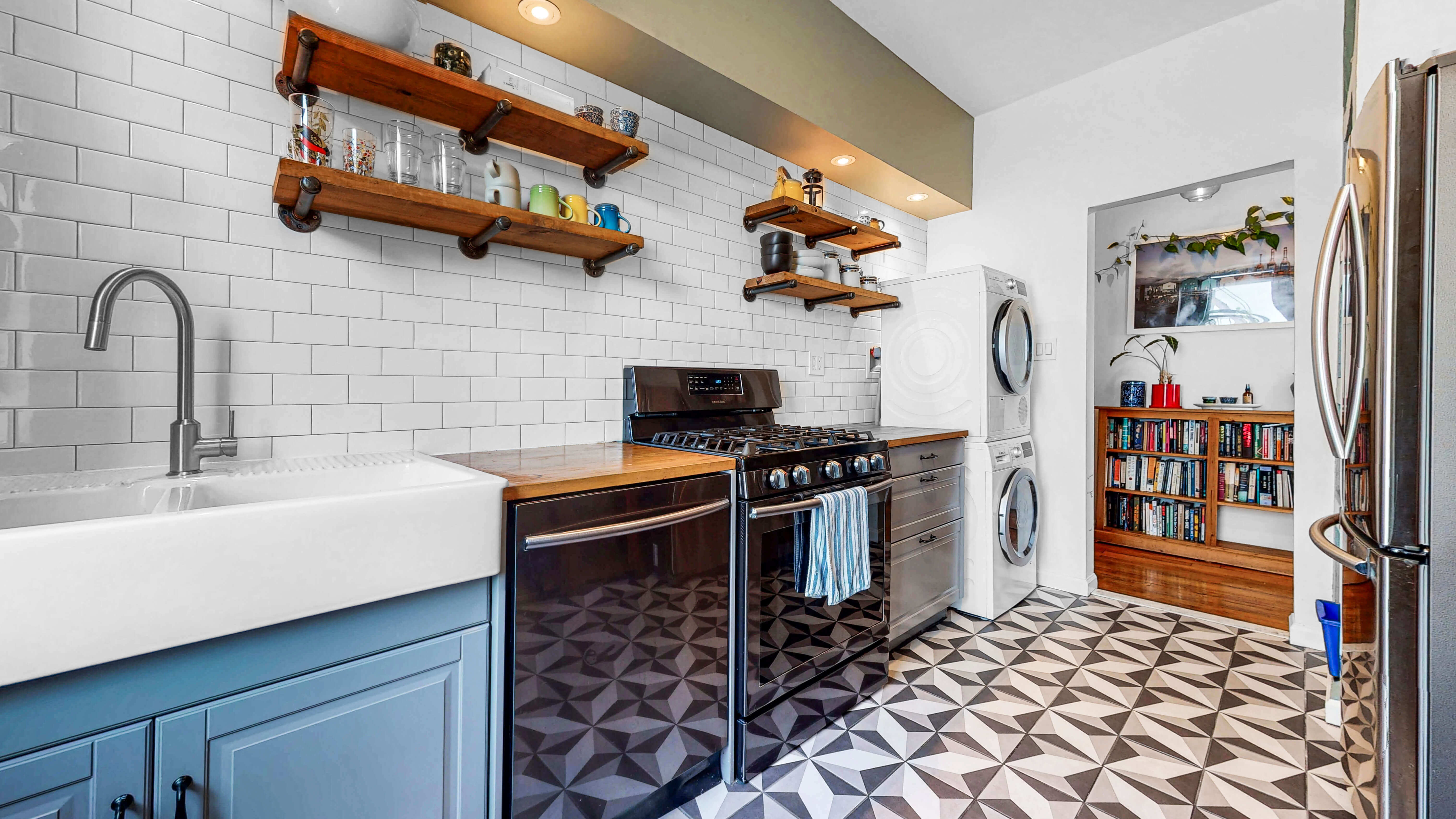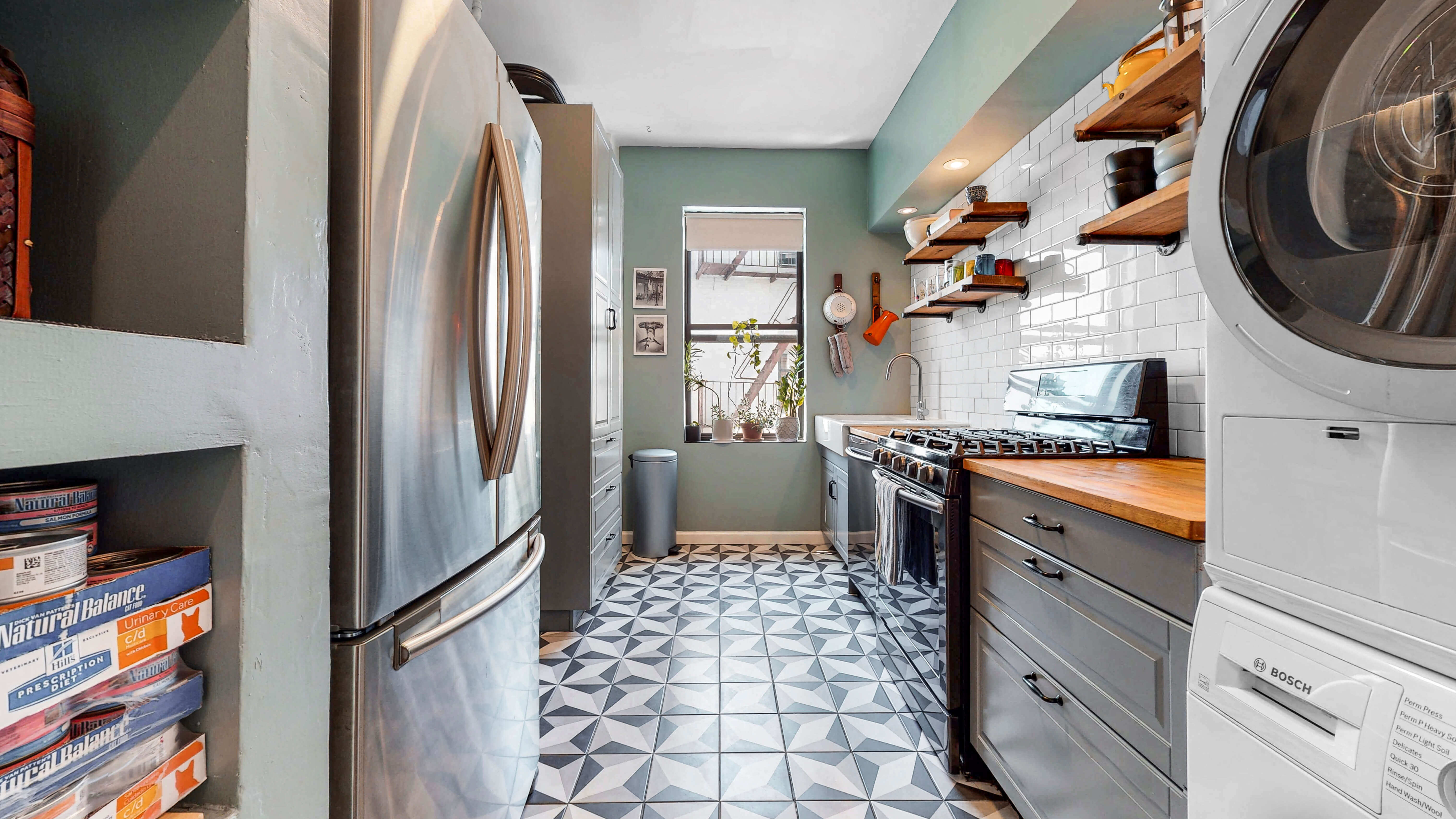 The living area is flooded with daylight through three big windows, and an exposed brick feature wall highlights this unit’s prewar character. The kitchen has an artsy, sophisticated feel with decorative floor tiles with a fun geometric pattern. Cleverly designed, this cheerful kitchen maximizes space with floor-to-ceiling cabinetry that’s clean and contemporary in a soft dove gray. An open pantry offers enough depth to accommodate small specialty appliances for the home baker or cook. The kitchen also features stainless steel appliances including a dishwasher, a washer and dryer, white subway tile backsplash, oak butcher block countertops, and recessed lighting.