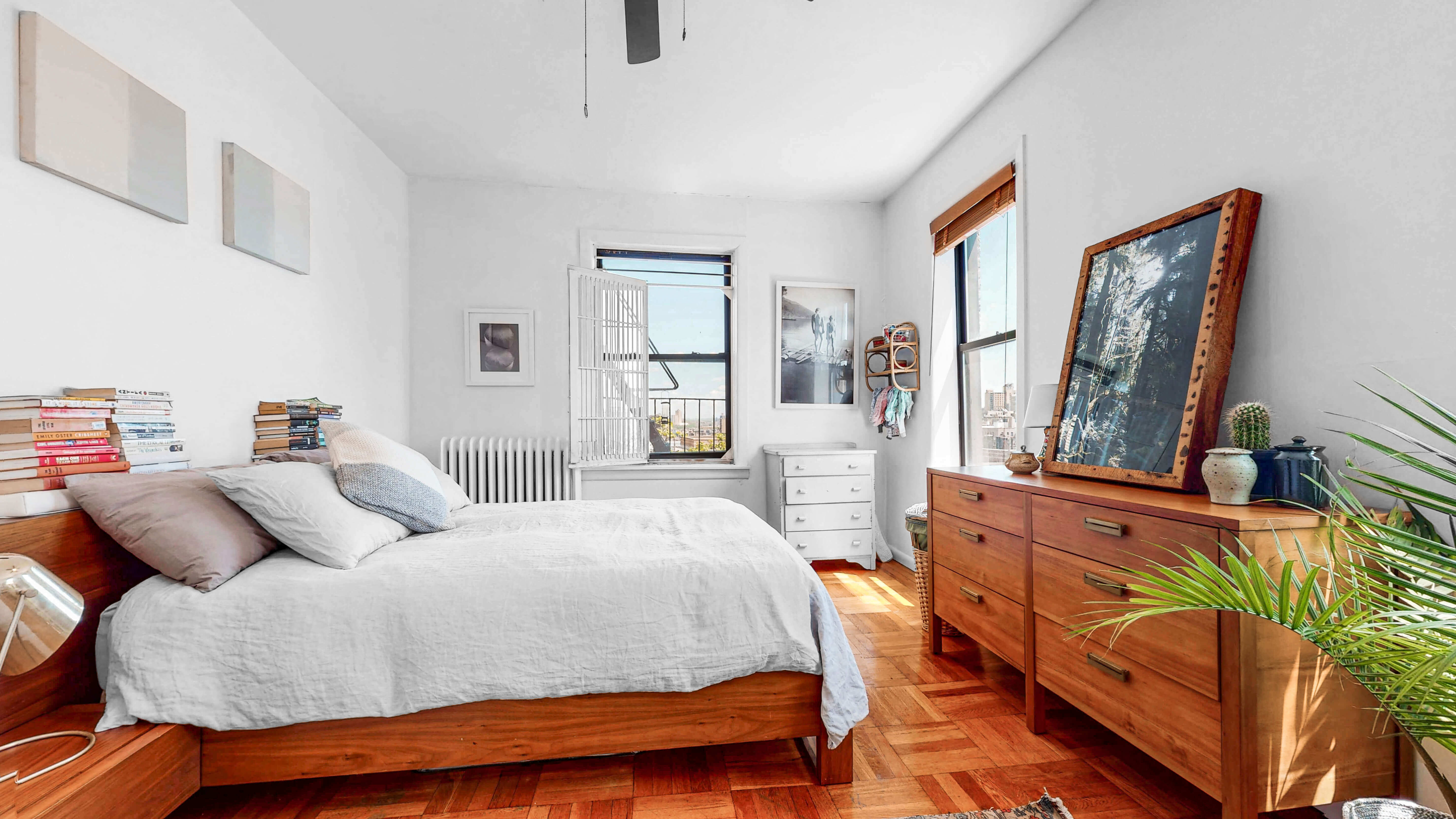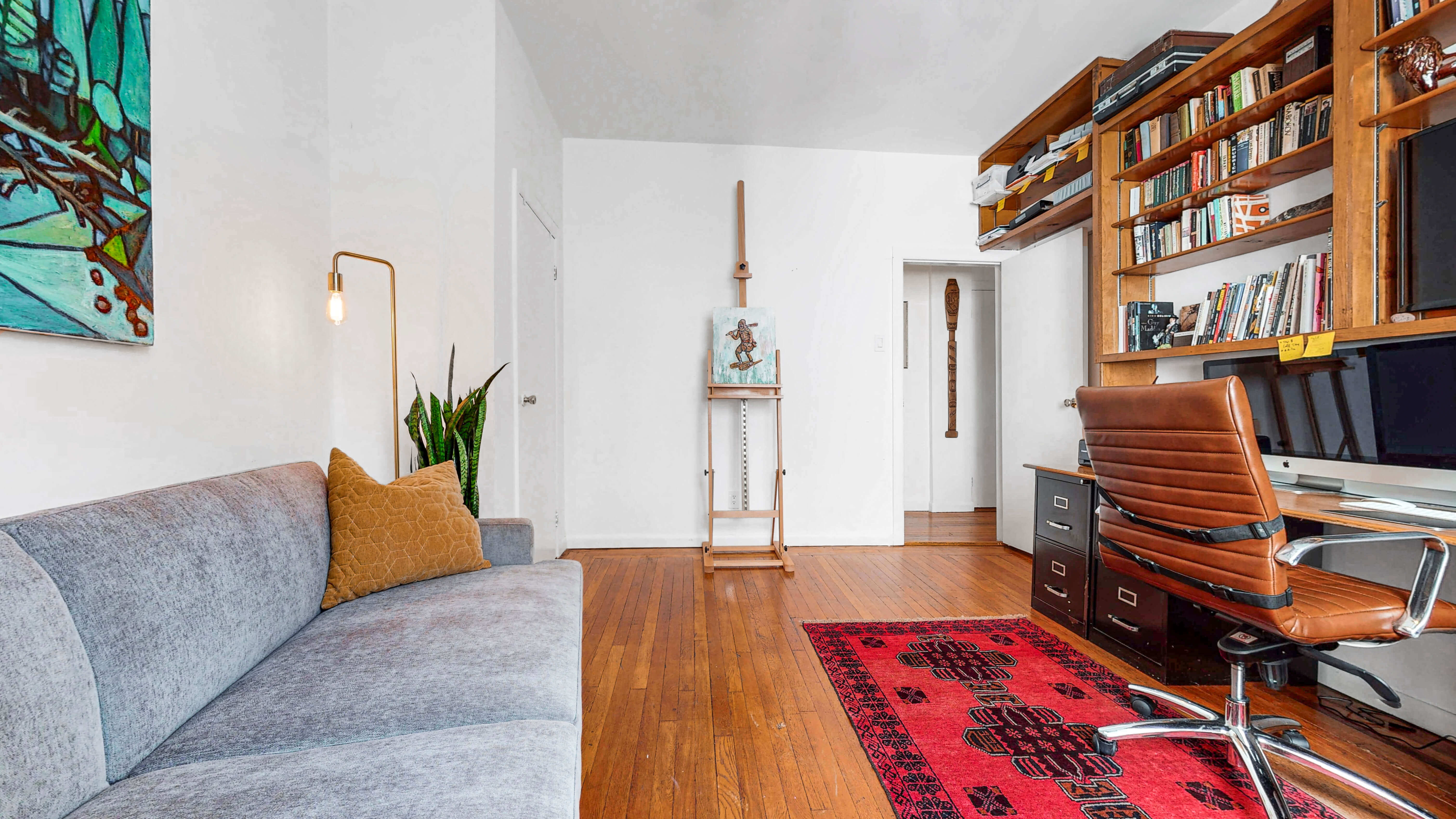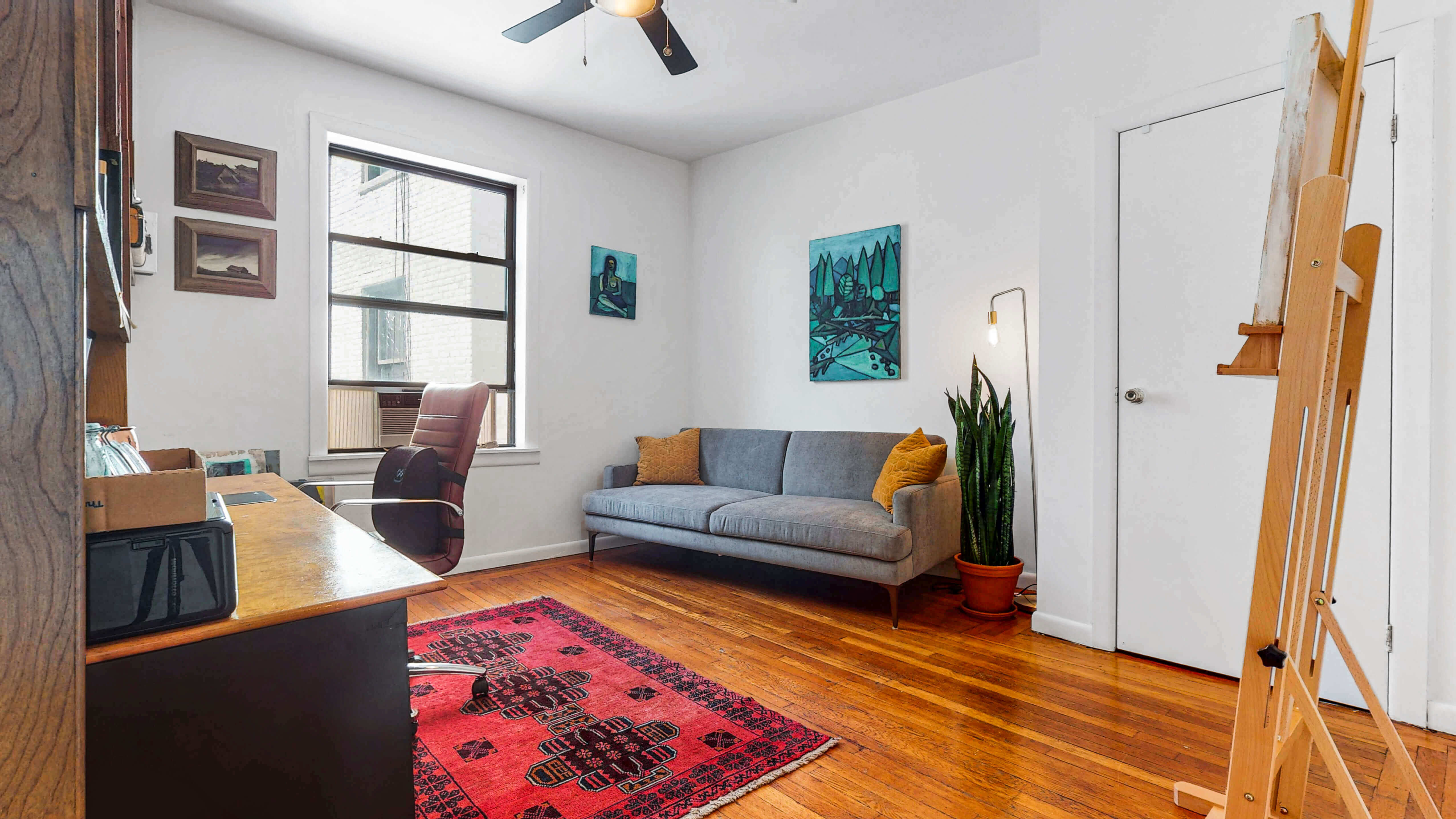 Conveniently located in vibrant Hudson Heights, this well-kept, prewar residential building welcomes you home through decorative vestibules with a touch of old-world charm. Every day, you’ll enjoy big, bright rooms that encourage you to take a deep, restorative breath. Tawny-hued floors throughout the unit provide a warm, welcoming foundation, and ceiling fans in both bedrooms and the living area add to the airy feel of the tall ceilings. Large, sunny windows abound, even in the kitchen.